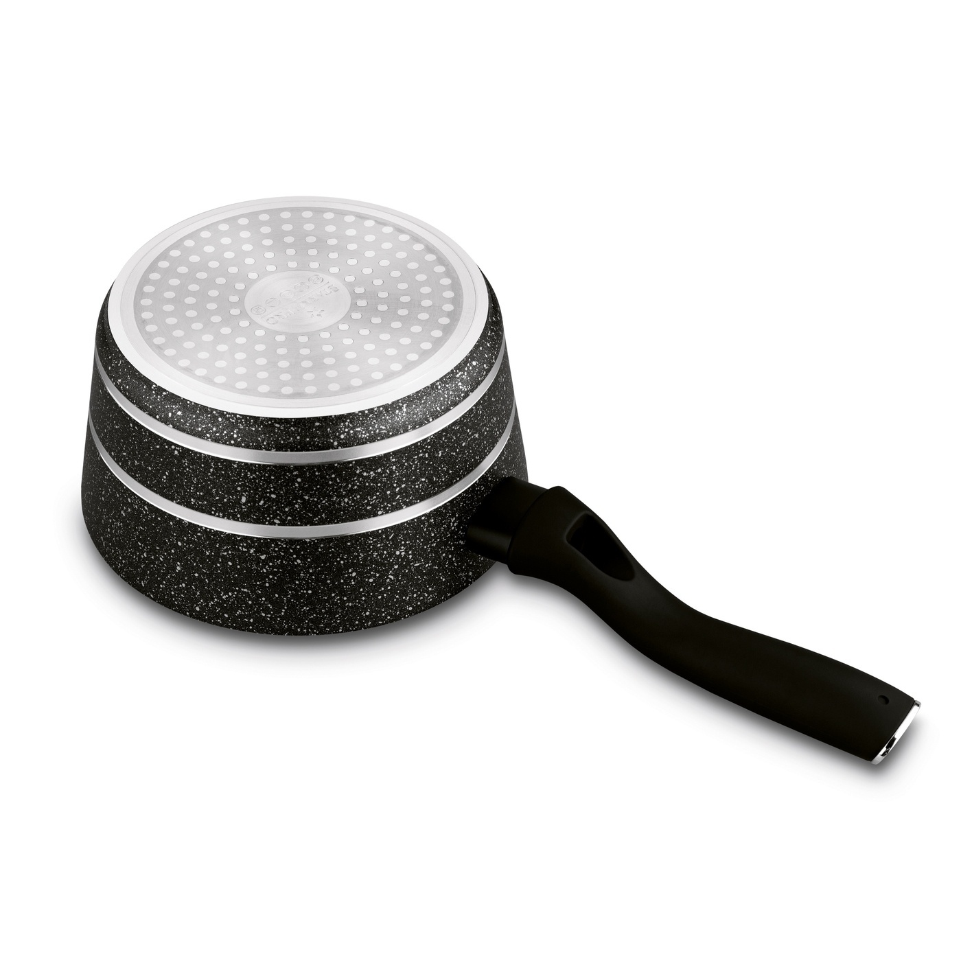 - rondel aluminiowy pokryty powłoką Marble Plus o wysokiej przyczepności i doskonałej odporności na ścieranie i zarysowania - powłoka trzywarstwowa - 10 000 cykli ścierania - PFOA free - grubość dna: 3,5 mm - grubość ścianki: 2,7 - grubość brzegu: 4,2 mm - antypoślizgowy uchwyt z tworzywa sztucznego typu soft touch - uchwyt nitowany, część z tworzywa sztucznego przykręcana - wygodna wylewka - pojemność całkowita: 1,4 l - pojemność użytkowa: 1 l |