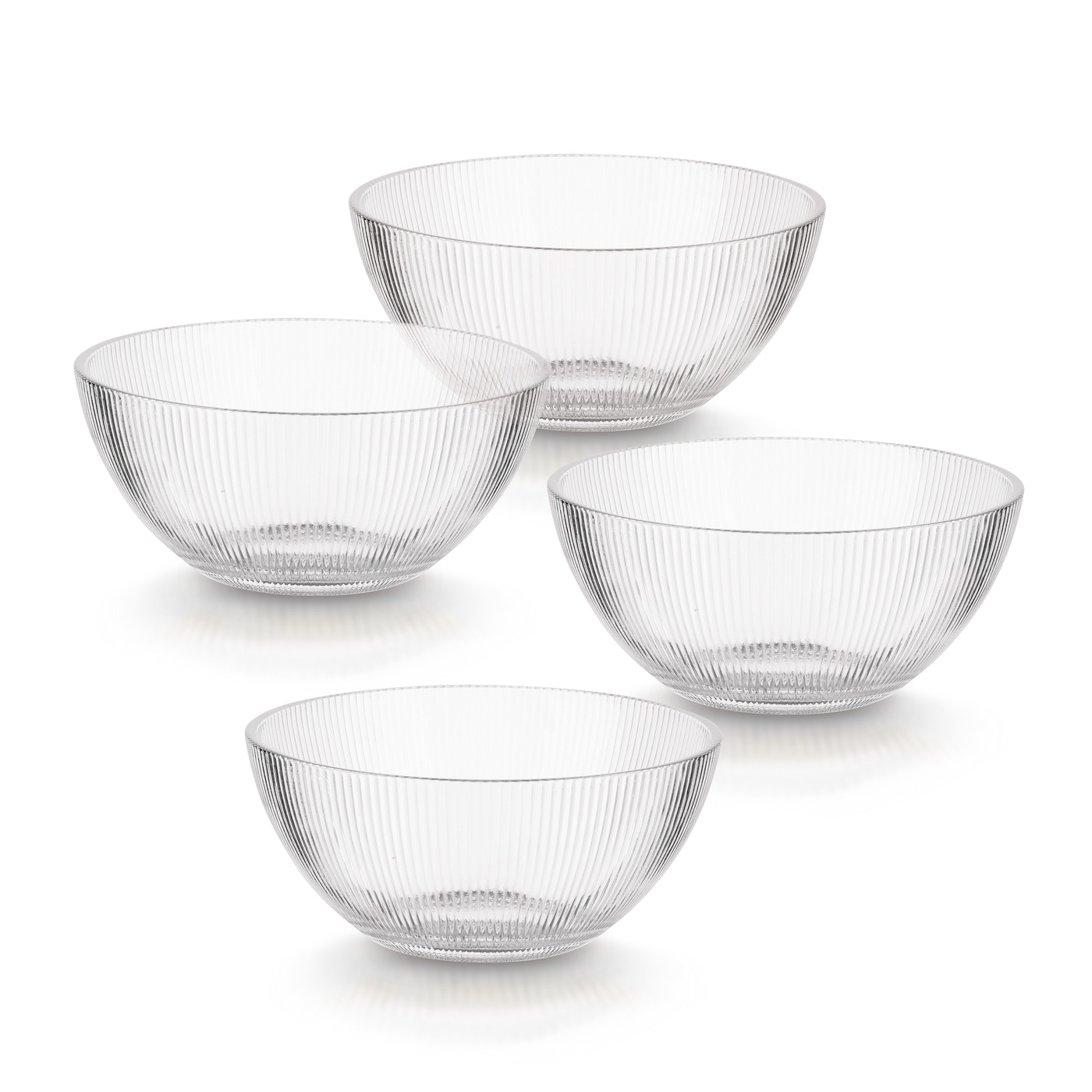 Pasują do zastawy obiadowej w różnym stylu. To dlatego, że komplet jest szklany i przezroczysty. Ma też proste wzornictwo wzbogacone symetrycznym tłoczeniem. Prosty kształt misek ułatwia ich sprawną pielęgnację.
