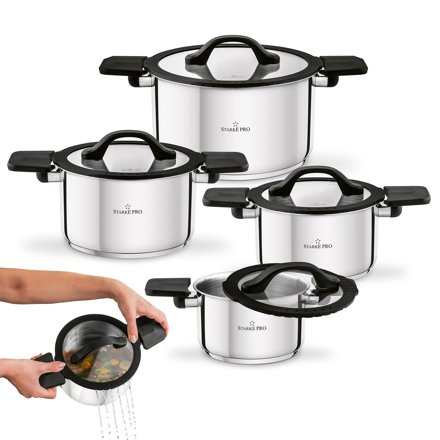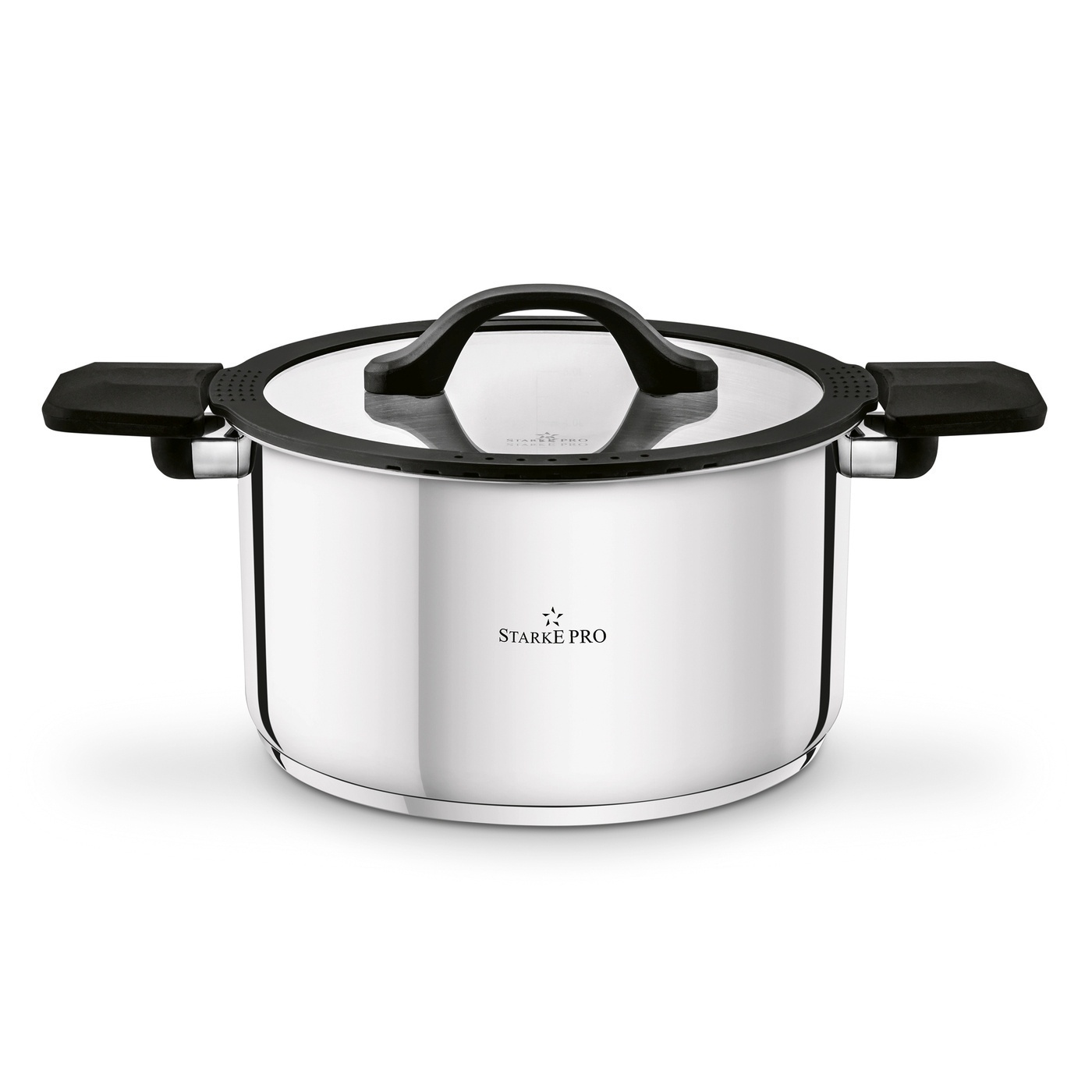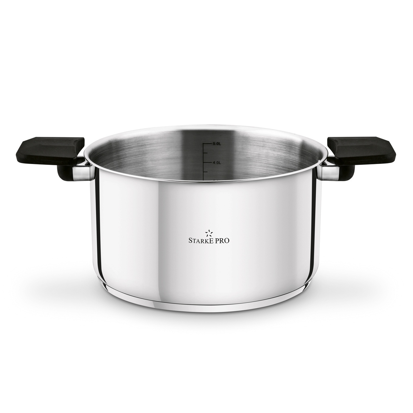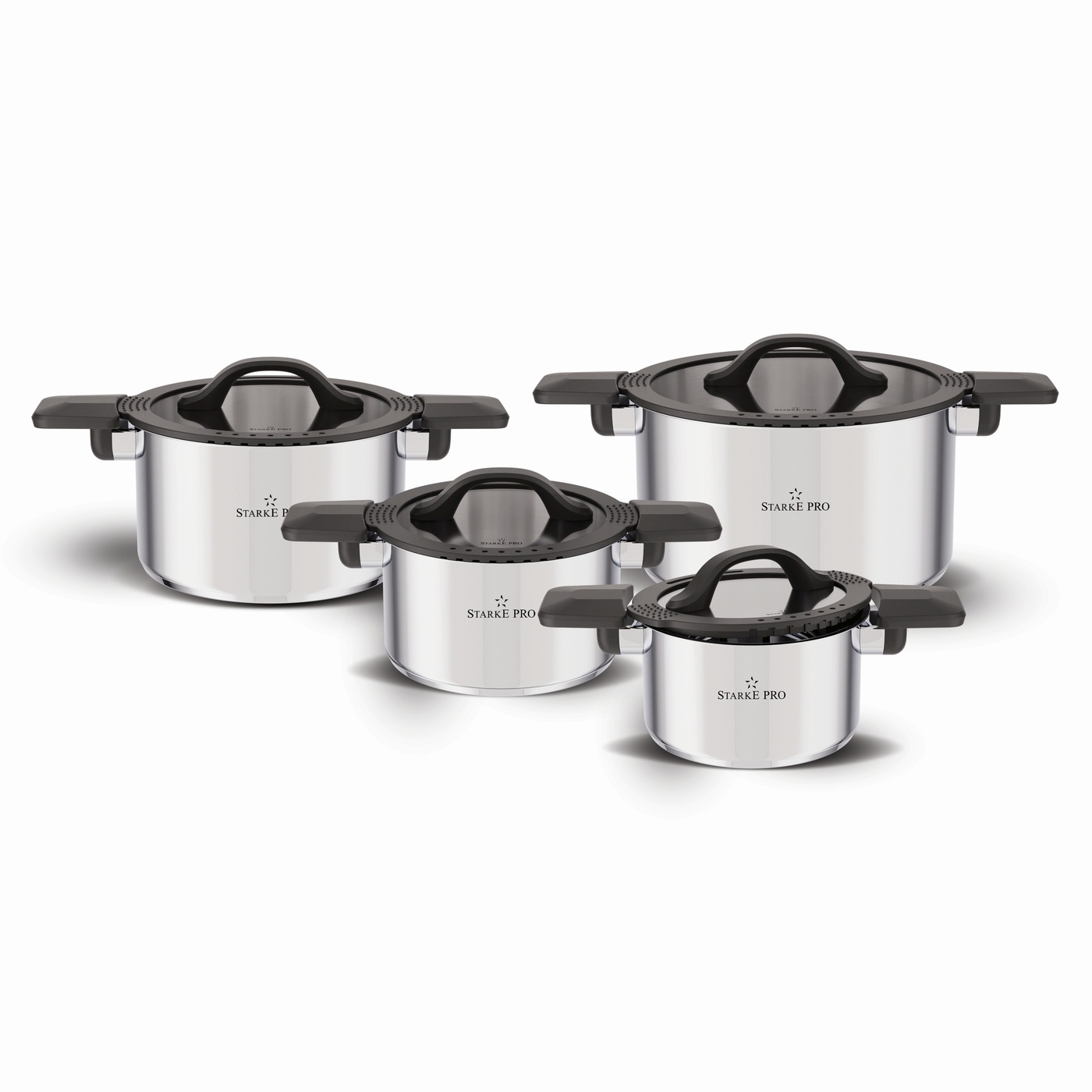 Zestaw garnków Starke Pro Creativo 8 elementów wykonano z wysokiej jakości stali nierdzewnej typu 18/10, która gwarantuje odporność na uszkodzenia oraz bezpieczne gotowanie przez wiele lat. Każdy garnek wyposażono w pięciowarstwowe dno – dzięki temu naczynia nagrzewają się równomiernie i długo utrzymują temperaturę, co sprzyja energooszczędnemu gotowaniu. Zestaw można stosować na wszystkich rodzajach kuchenek, w tym na indukcji.