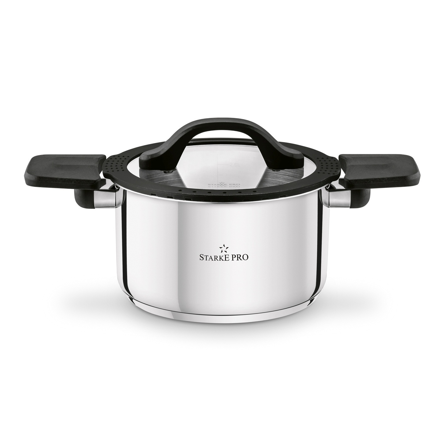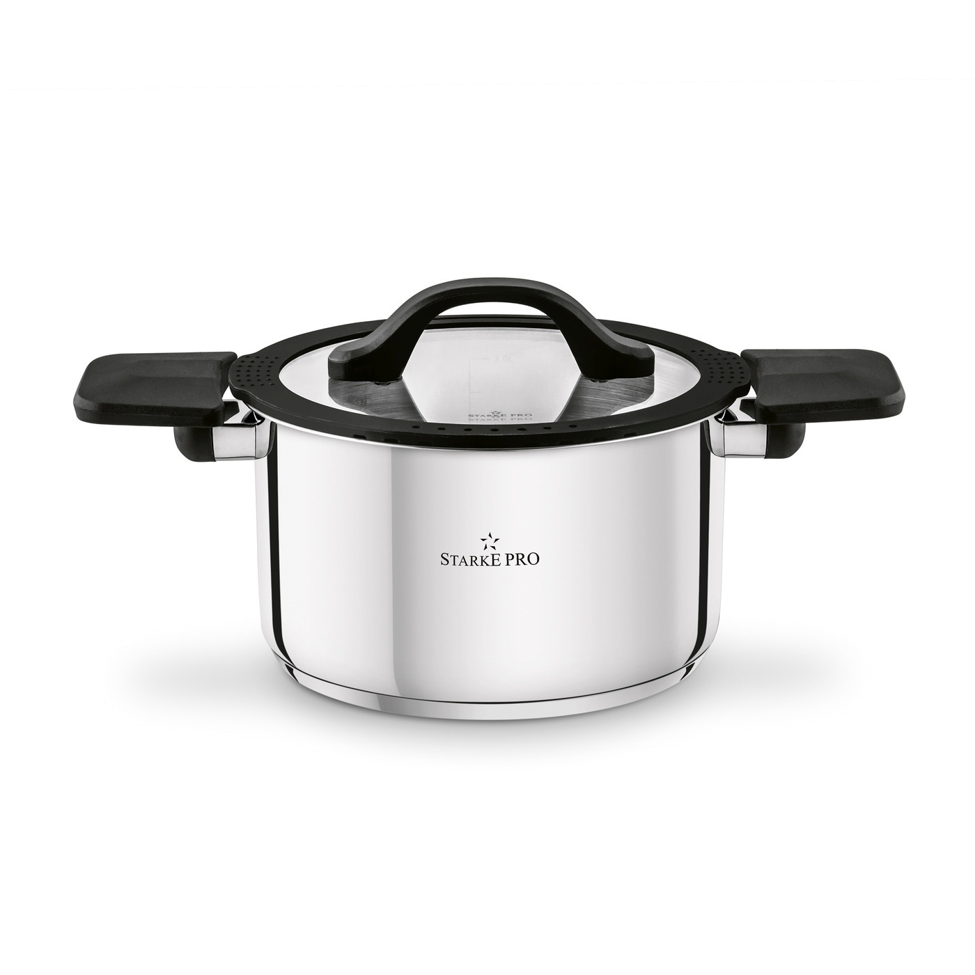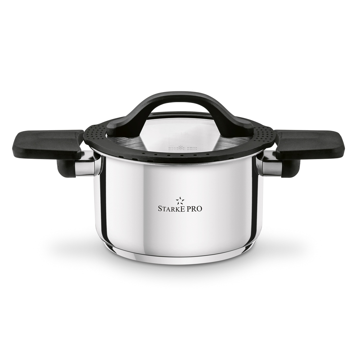 Zestaw garnków Starke Pro Creativo 8 elementów wykonano z wysokiej jakości stali nierdzewnej typu 18/10, która gwarantuje odporność na uszkodzenia oraz bezpieczne gotowanie przez wiele lat. Każdy garnek wyposażono w pięciowarstwowe dno – dzięki temu naczynia nagrzewają się równomiernie i długo utrzymują temperaturę, co sprzyja energooszczędnemu gotowaniu. Zestaw można stosować na wszystkich rodzajach kuchenek, w tym na indukcji.