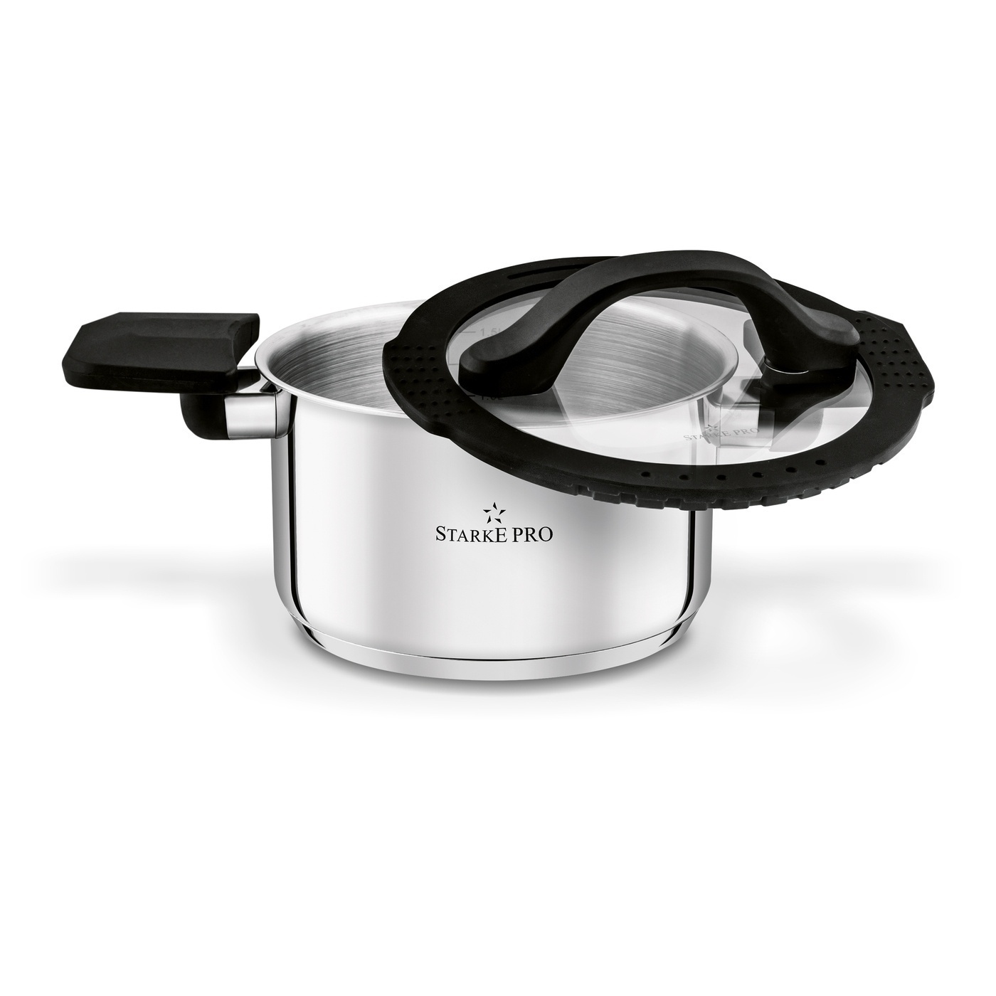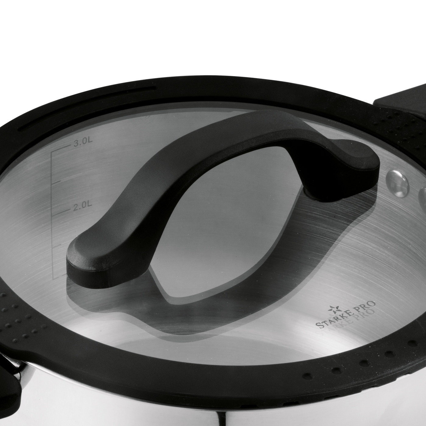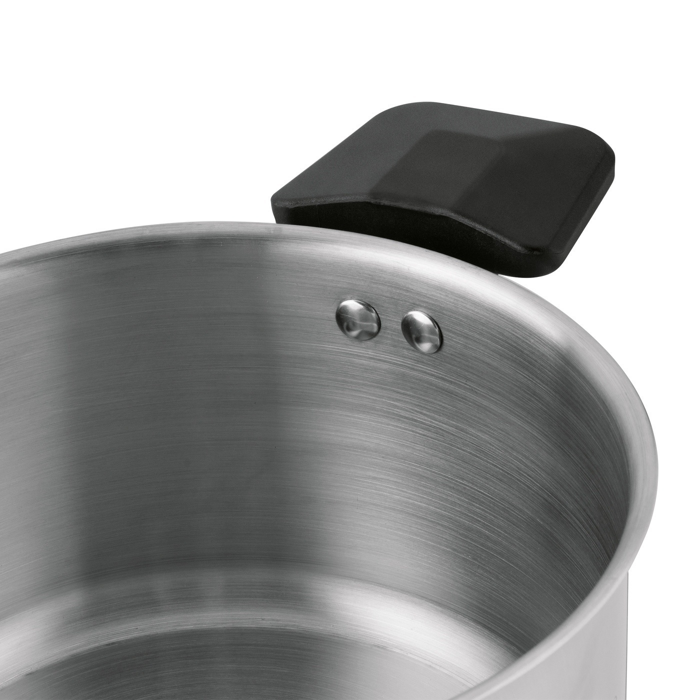 Nitowane uchwyty połączono z elementami z tworzywa sztucznego, które zapobiegają ich nagrzewaniu. Ułatwia to przenoszenie pełnych naczyń i poprawia komfort codziennego gotowania. Wnętrze garnków wzbogacono o praktyczną skalę litrażu – dzięki niej łatwo odmierzysz potrzebną ilość wody. Pokrywki wykonano z odpornego szkła i wyposażono w silikonowy rant oraz odpowietrznik pary, który poprawia bezpieczeństwo i wygodę użytkowania.
