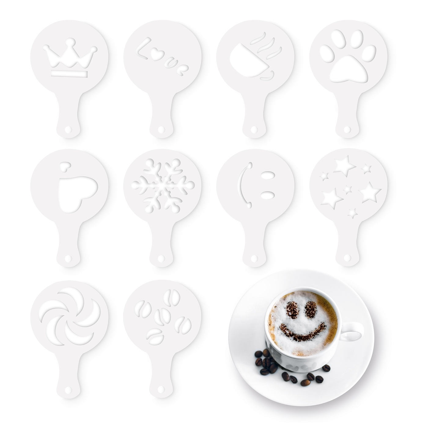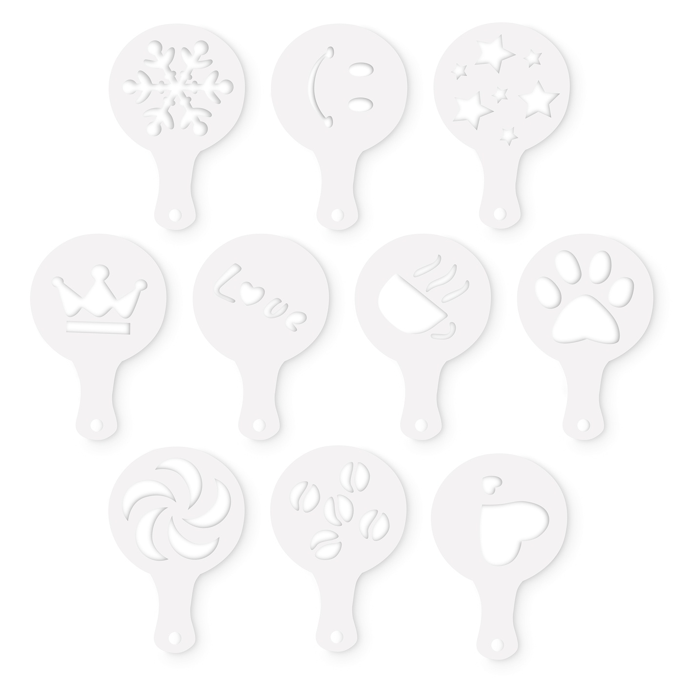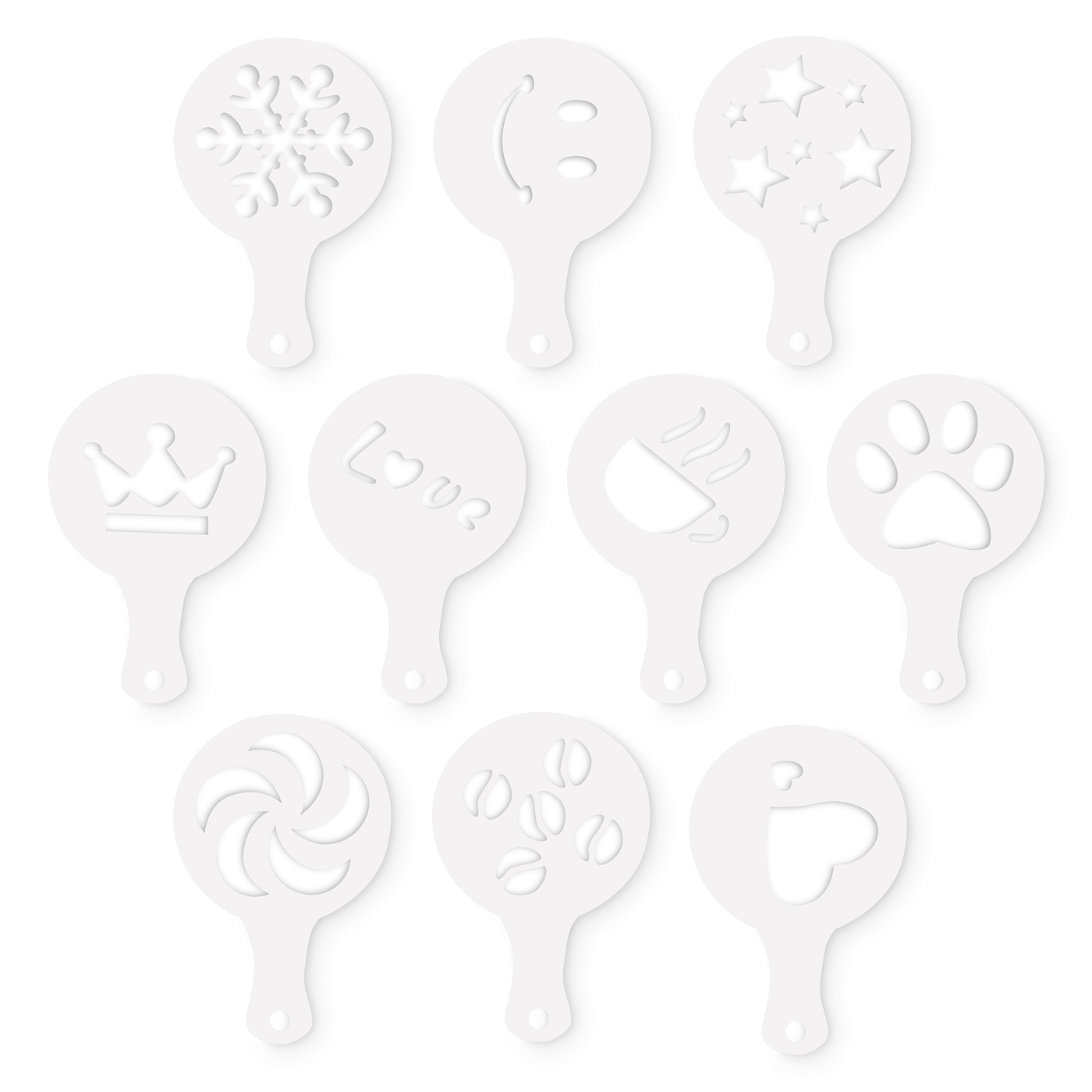 Świetnie sprawdzą się przy dekoracji kaw. Szablony są okrągłe i mają praktyczny uchwyt do wygodnego trzymania nad filiżanką lub kubkiem. Znajdziesz tu 10 różnych wzorów, w tym gwiazdki, uśmiechniętą buźkę i napis LOVE.