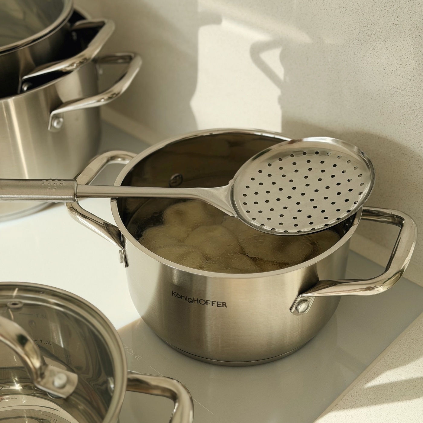 Wyłowienie mięsa z rosołu, czy też odsączenie ulubionych pierogów to bardzo proste czynności, o ile ma się pod ręką szumówkę. To praktyczne narzędzie powinno znaleźć się w kuchni każdego, kto lubi gotować, gdyż nie tylko chroni użytkownika przed oparzeniem, ale także zapobiega rozerwaniu składników (np. potraw gotowanych z farszem). Lekko zagięty profil z delikatnym rantem sprawia natomiast, że jedzenie nie zsunie się podczas nakładania na talerz.
