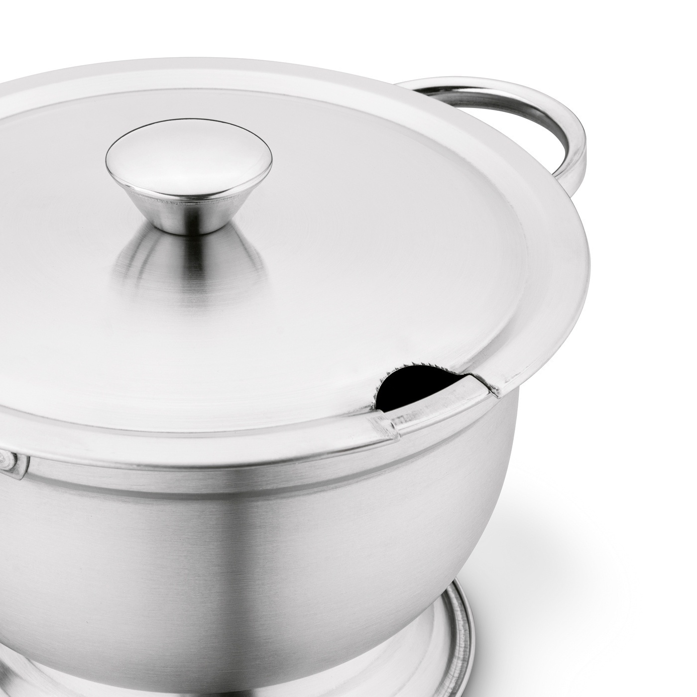 Model ma w zestawie stalową pokrywę. Ochroni ona zawartość przed zanieczyszczeniem. Zminimalizuje również ryzyko rozlania, gdy np. ktoś potrąci kuchenną wazę do zupy Tadar 2,7 l. W pokrywce jest wycięcie. Pozwala ono na ustawienie naczynia razem z chochelką do nabierania. Satynowe wykończenie podkreśli jej pozycję na stole.