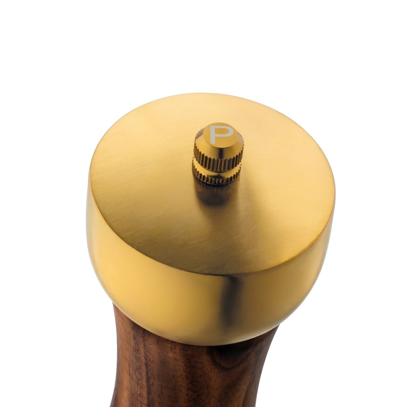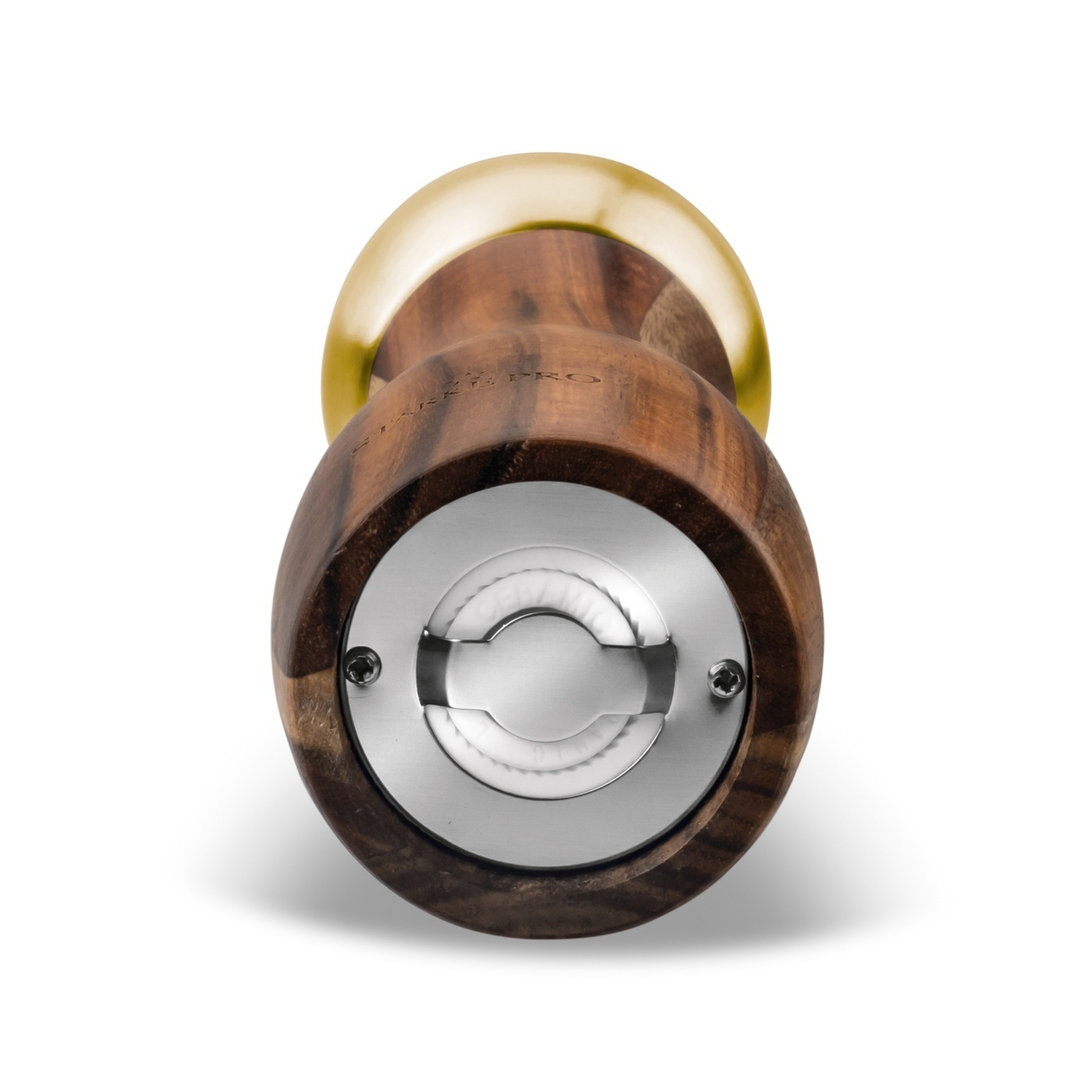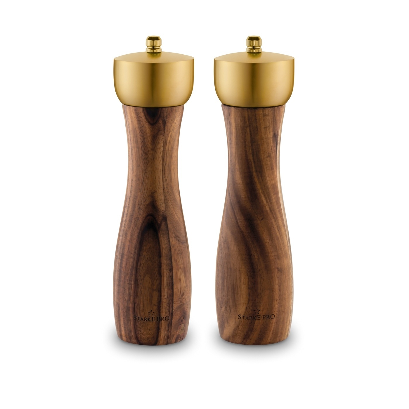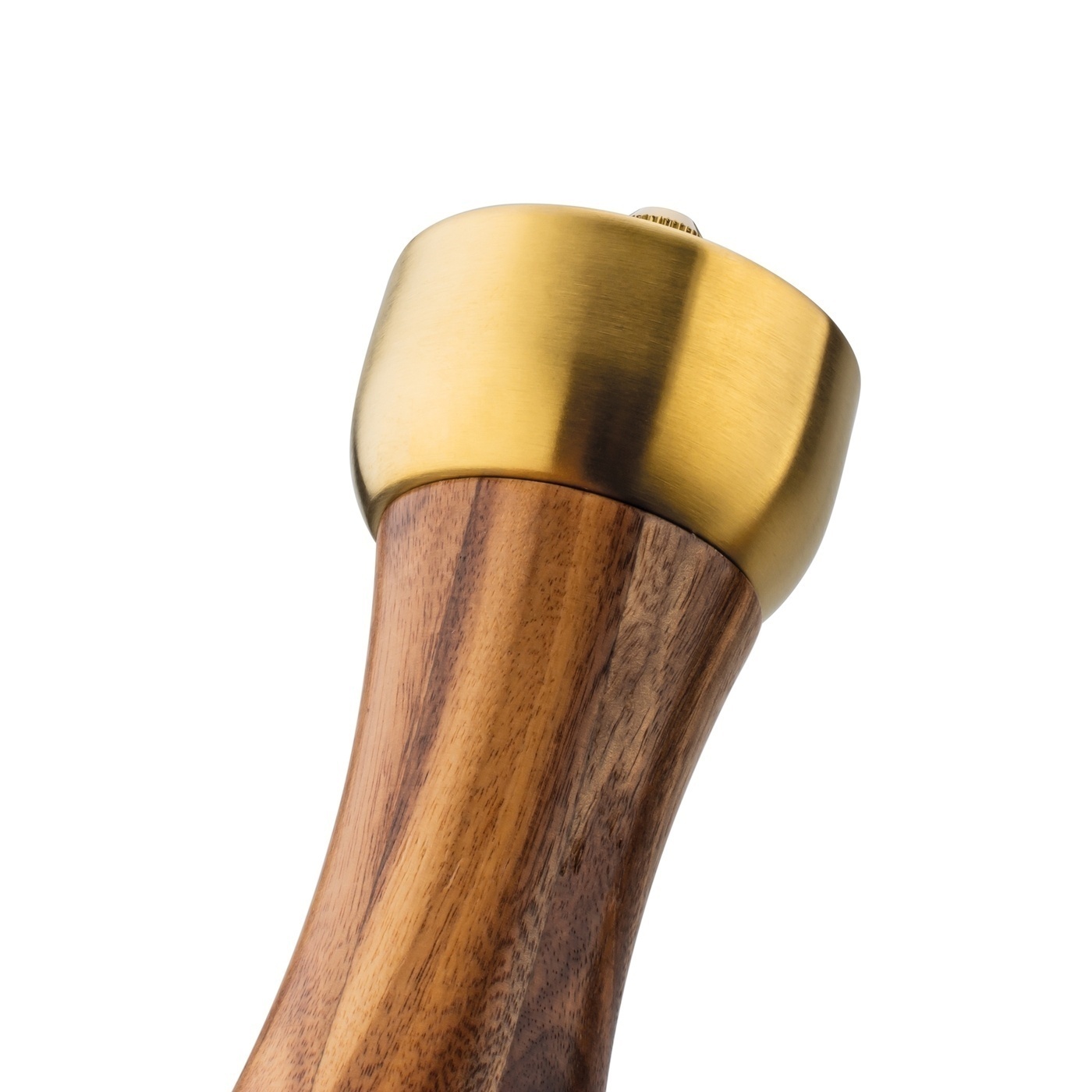 Prezentowany zestaw młynków wykonano z ekologicznego drewna akacjowego. Dzięki temu charakteryzują się niepowtarzalnym wyglądem – układem słojów, mozaiką barw oraz wzorem struktury użytego kawałka drewna. Ich elegancję podkreśla złote pokrętło.
