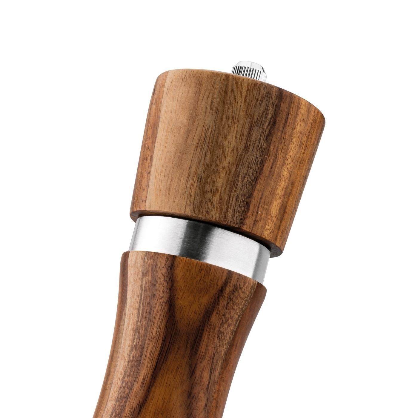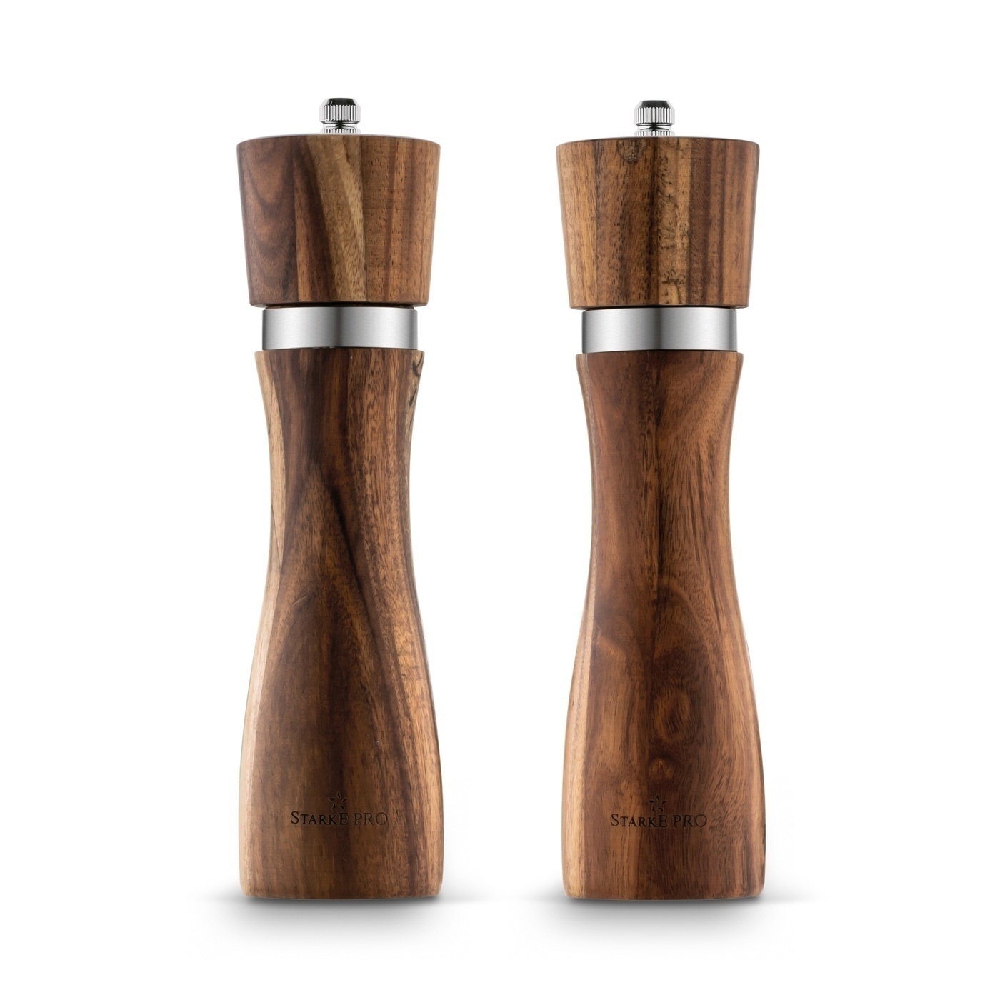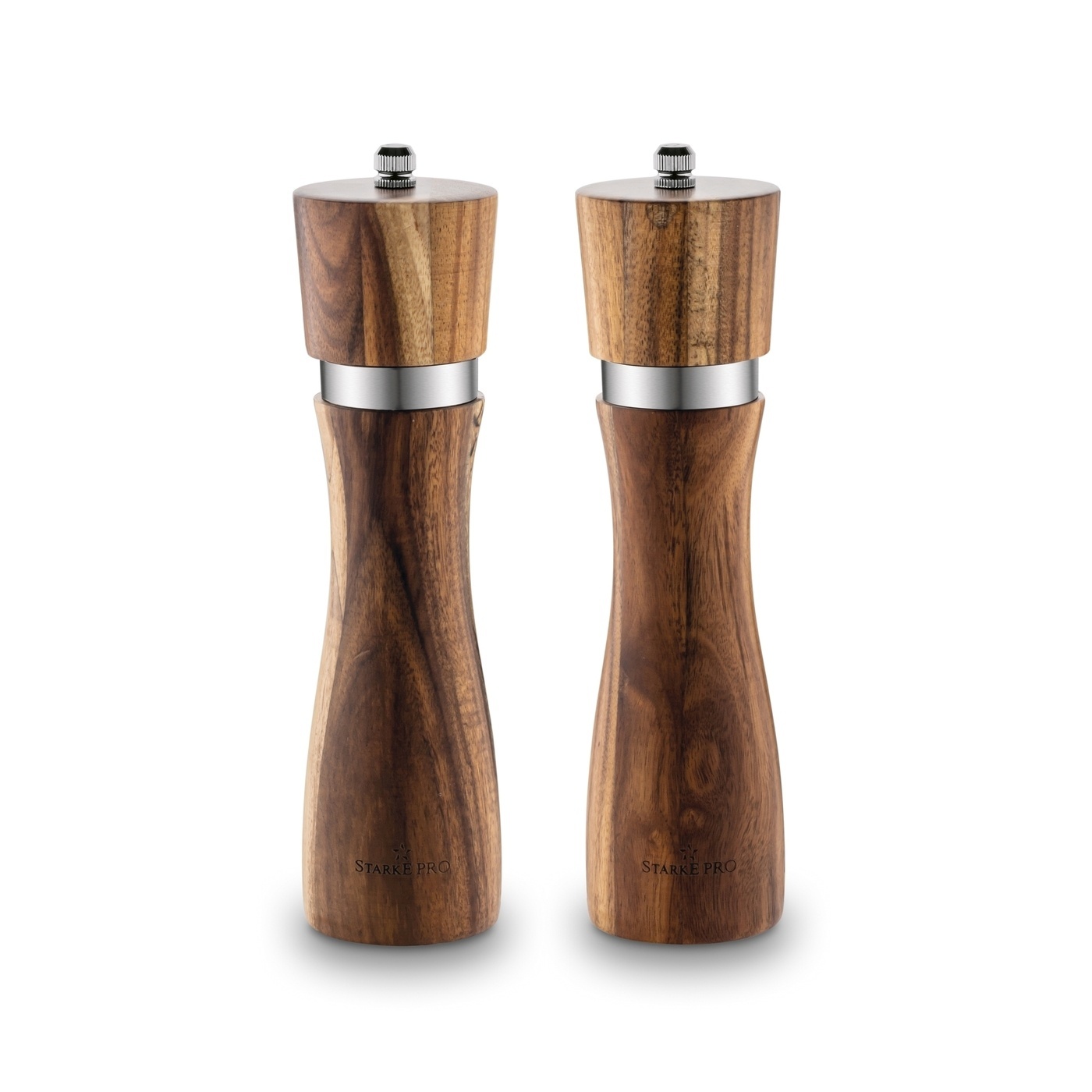 Prezentowany zestaw młynków wykonano z ekologicznego drewna akacjowego. Dzięki temu charakteryzują się niepowtarzalnym wyglądem – układem słojów, mozaiką barw oraz wzorem struktury użytego kawałka drewna. Ich elegancję podkreślają srebrne detale.