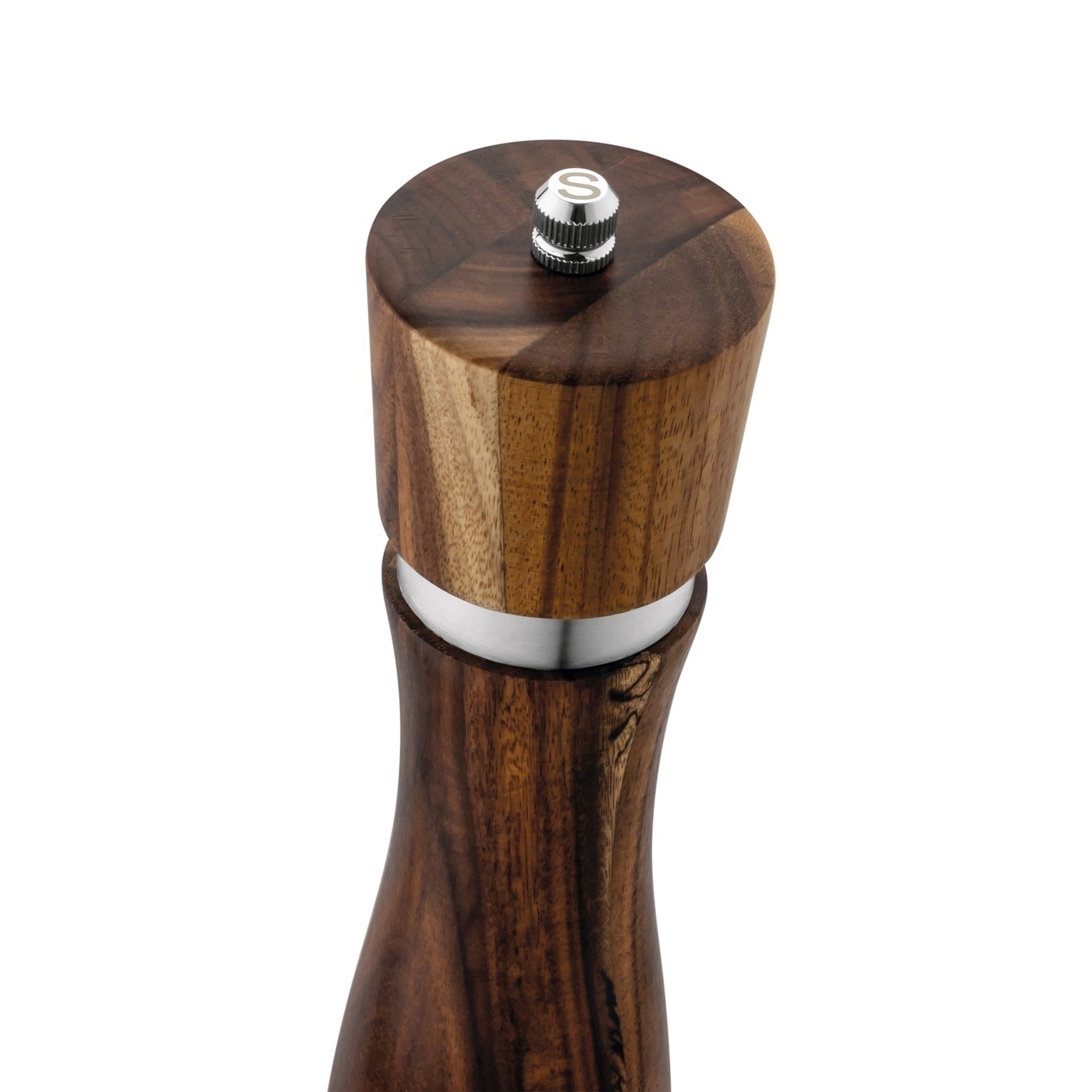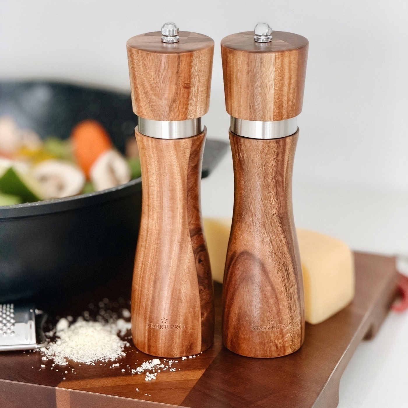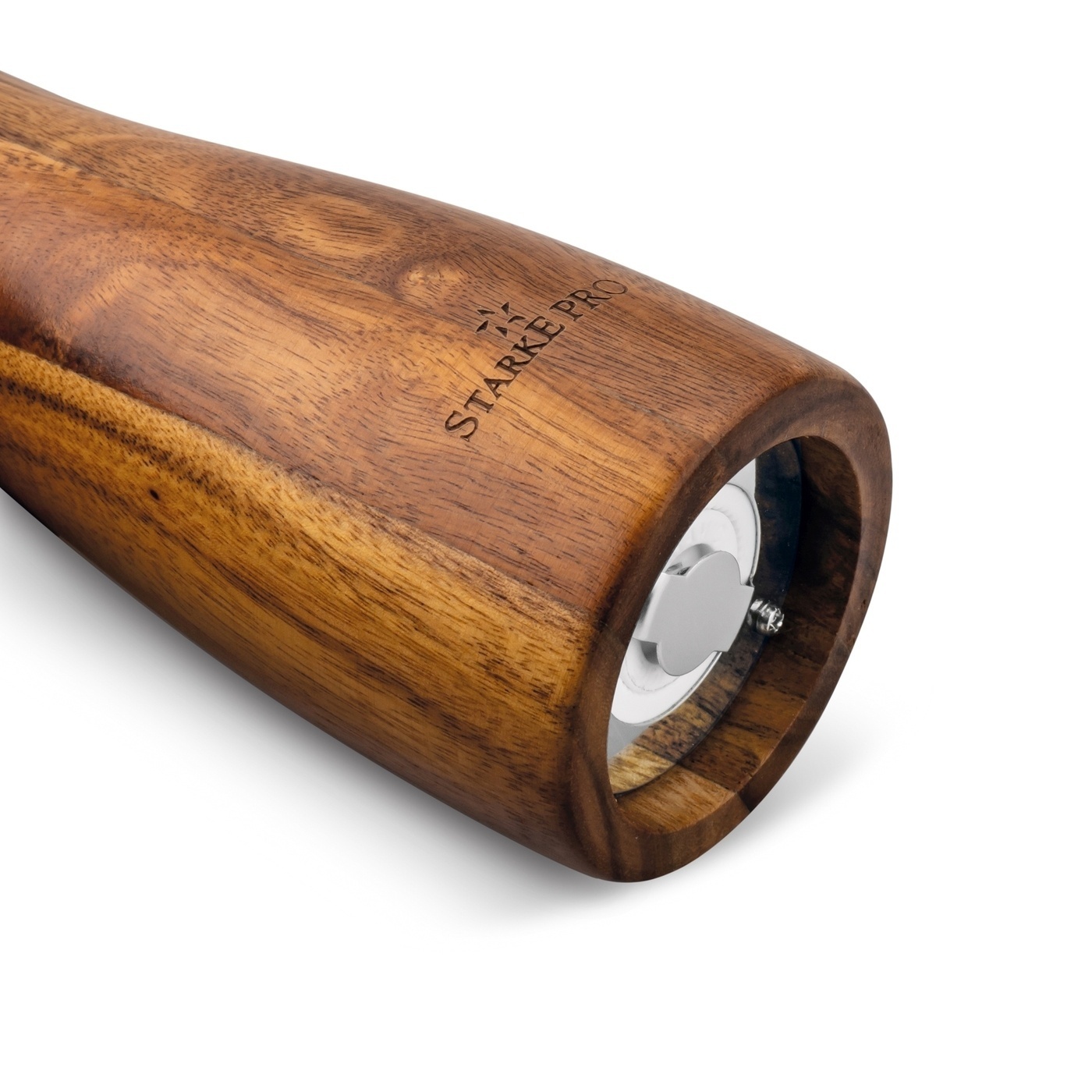 Prezentowany zestaw młynków wykonano z ekologicznego drewna akacjowego. Dzięki temu charakteryzują się niepowtarzalnym wyglądem – układem słojów, mozaiką barw oraz wzorem struktury użytego kawałka drewna. Ich elegancję podkreślają srebrne detale.