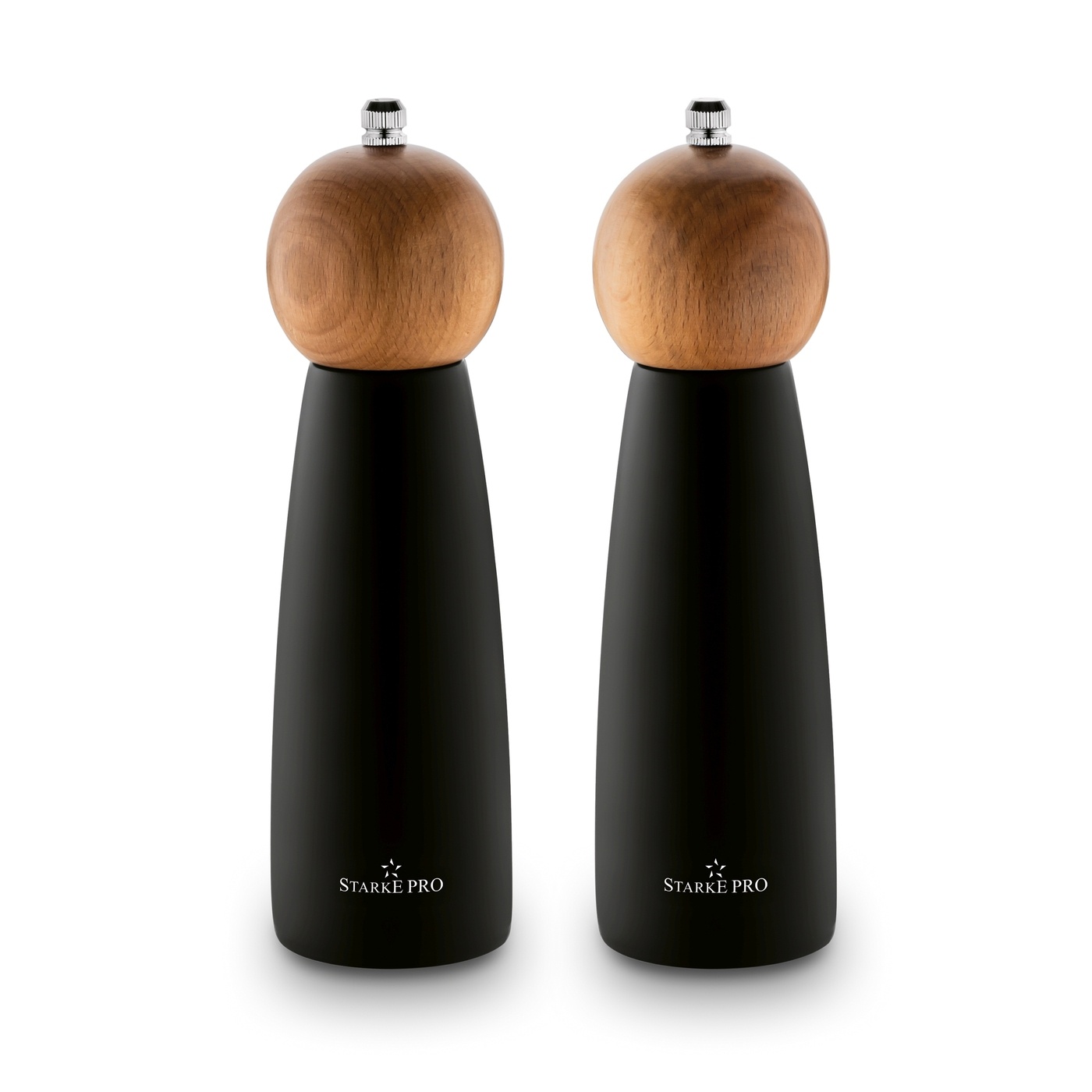 Prezentowany zestaw młynków wykonano z dwóch gatunków ekologicznego drewna – bukowego (pokrętło) i kauczukowego (korpus). Ich elegancję podkreśla czarne malowanie.