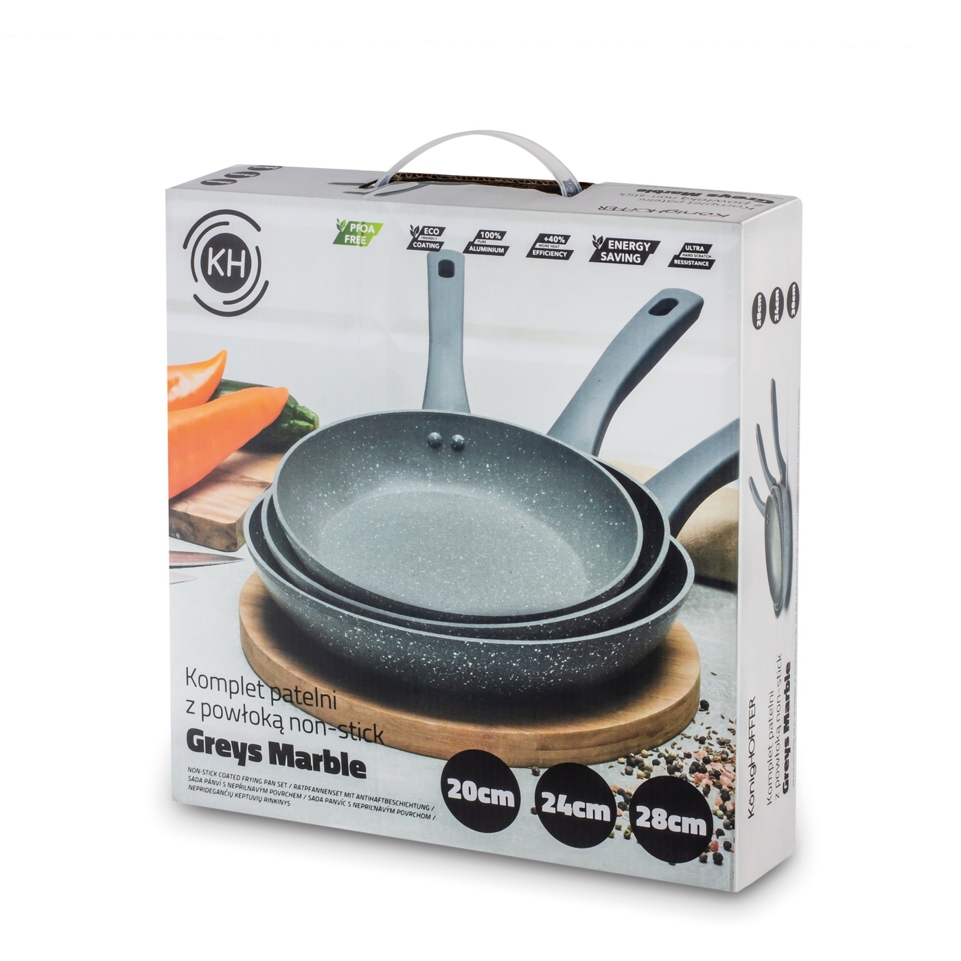 Z nimi w kuchni solidnie zadbasz o apetyt bliskich! Ich trwałe korpusy wykute w wysokiej temperaturze z aluminium (technika forged!) charakteryzuje bardzo dobre wyważenie. Na patelniach z kolekcji Greys Marble możesz pracować w wysokiej temperaturze. Zrobisz to bez obaw, gdyż zestaw ma oznaczenie PFOA Free. Uniwersalna wysokość brzegu patelni pozwoli ci wygodnie mieszać składniki.