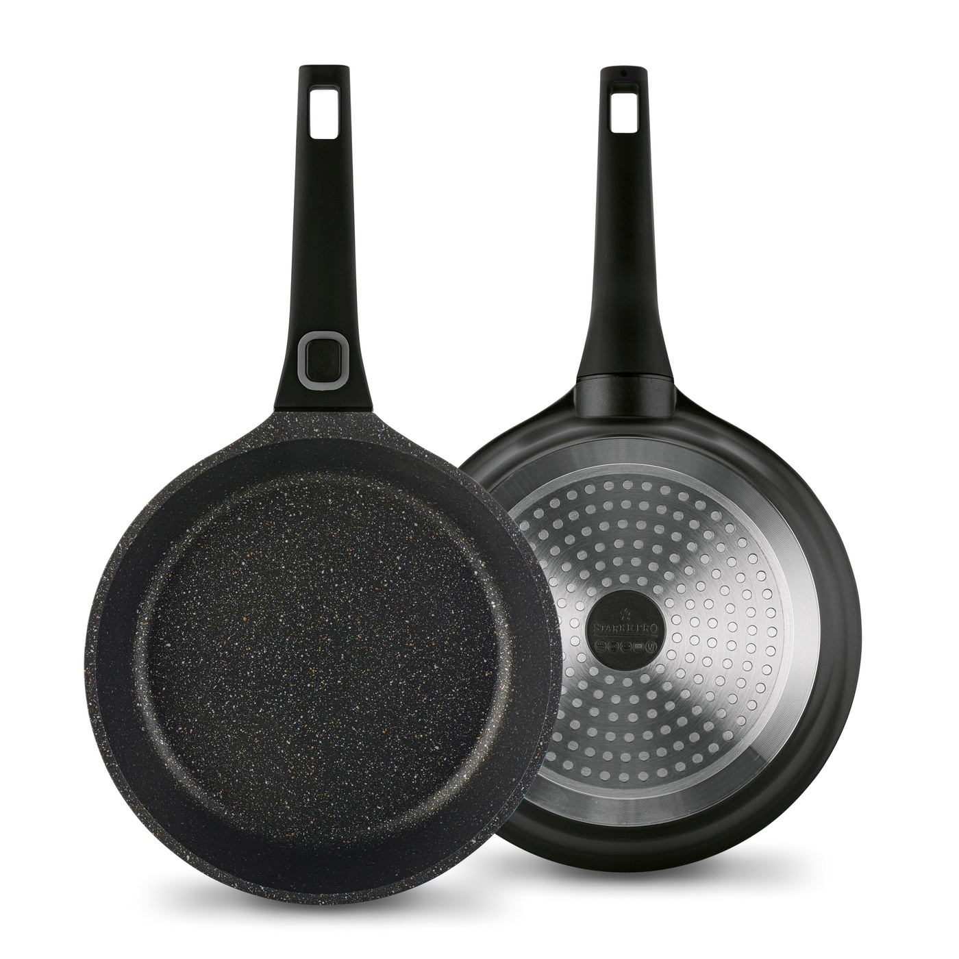 - korpus odlewany, wykonany z aluminium, pokryty powłoką Marble Plus posiadającą naturalną chropowatą teksturę o wysokiej przyczepności i doskonałej odporności na ścieranie i zarysowania - powłoka trzywarstwowa - 10 000 cykli ścierania - grubość dna: 3,4 mm - grubość ścianki: 1,7 mm - grubość brzegu: 5,8 mm - rączka z tworzywa sztucznego typu soft touch, odpinana - patelnię bez rączki można używać w piekarniku, maksymalna temperatura 200 st. - przy długotrwałym podgrzewaniu patelni należy odpiąć rączkę |