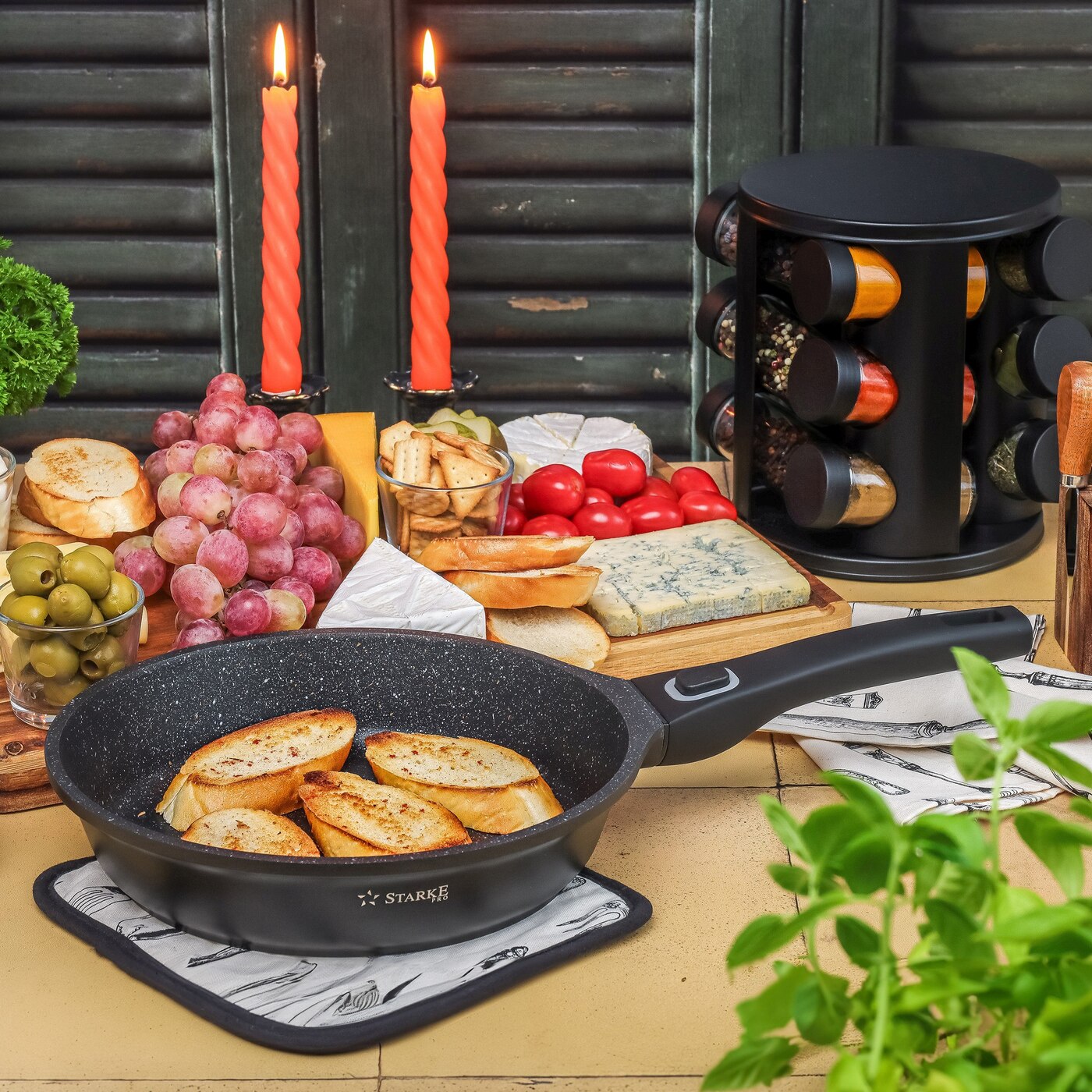 Płytką patelnię 28 cm i 2 patelnie standardowe 20/24 cm na gaz i indukcję Starke Pro Svart Marble rekomenduje do domowej kuchni Piotr Kucharski. Osobiście przetestował ich możliwości, jakość oraz zalety i wystawił im wysoką ocenę. Ciebie również ten zestaw patelni nie zawiedzie.