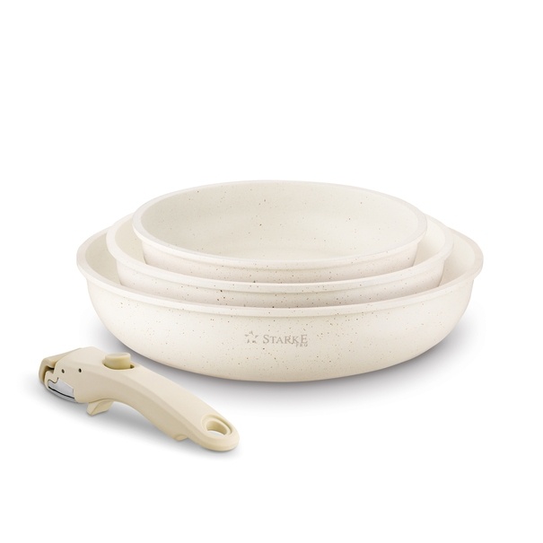 Korpus naczyń jest odlany z aluminium metodą die cast. Tak solidny komplet patelni możesz wykorzystać do tworzenia w bardzo wysokich temperaturach. Jak wysokich? Aż w 220 st. C, a nawet w piekarniku (wystarczy zdjąć rączkę!).