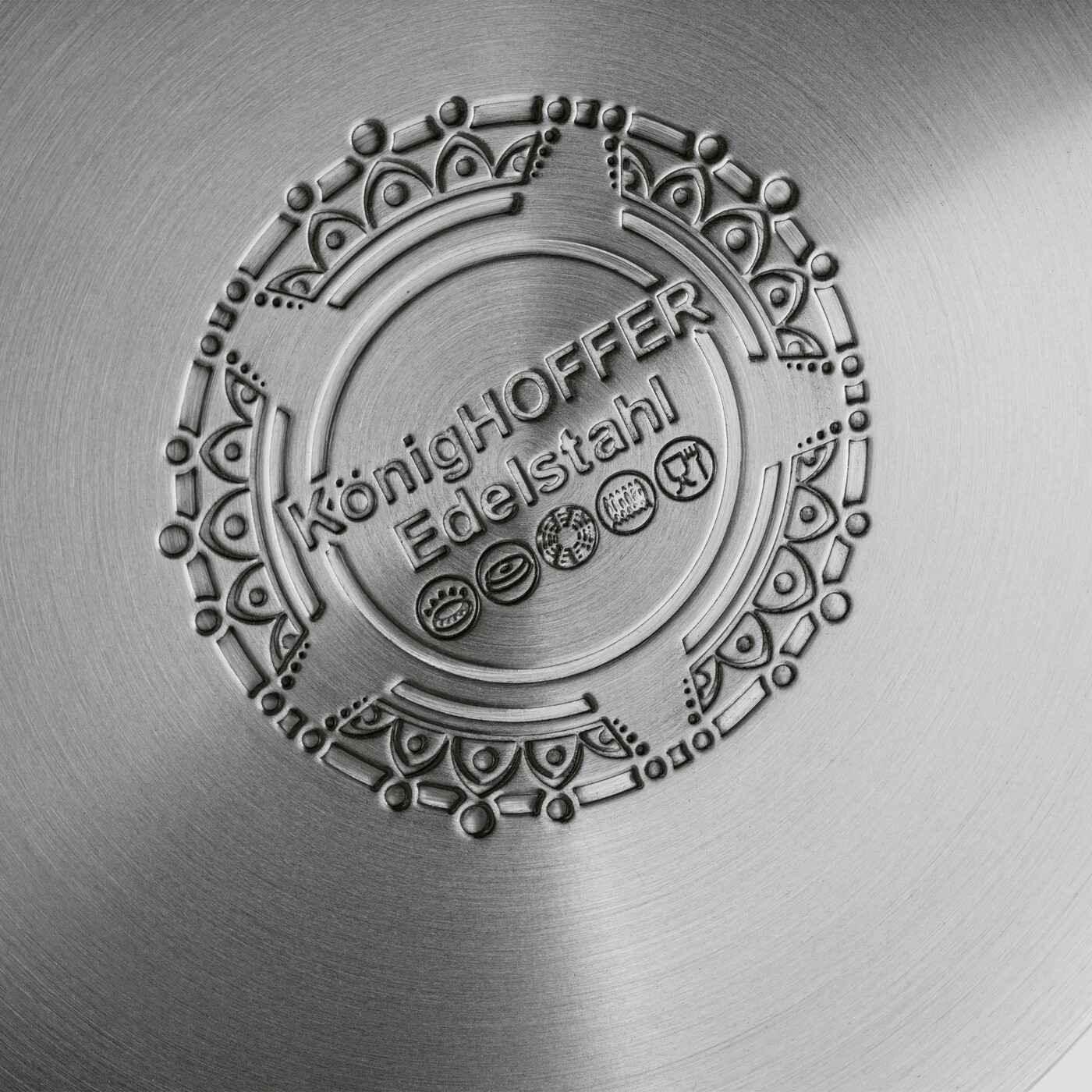 Garnki ze stali nierdzewnej Konighoffer Faro 10 elementów mają pojemność 1,2 / 1,8 / 2,6 / 3,4 / 5,9 l. Dołączone pokrywki wykończono metalowym rantem, który dobrze chroni je przed wyszczerbieniem. Odpowietrznik pary daje tu natomiast możliwość wydajnego duszenia posiłków. W ten sposób zabezpieczysz również przechowywane jedzenie.