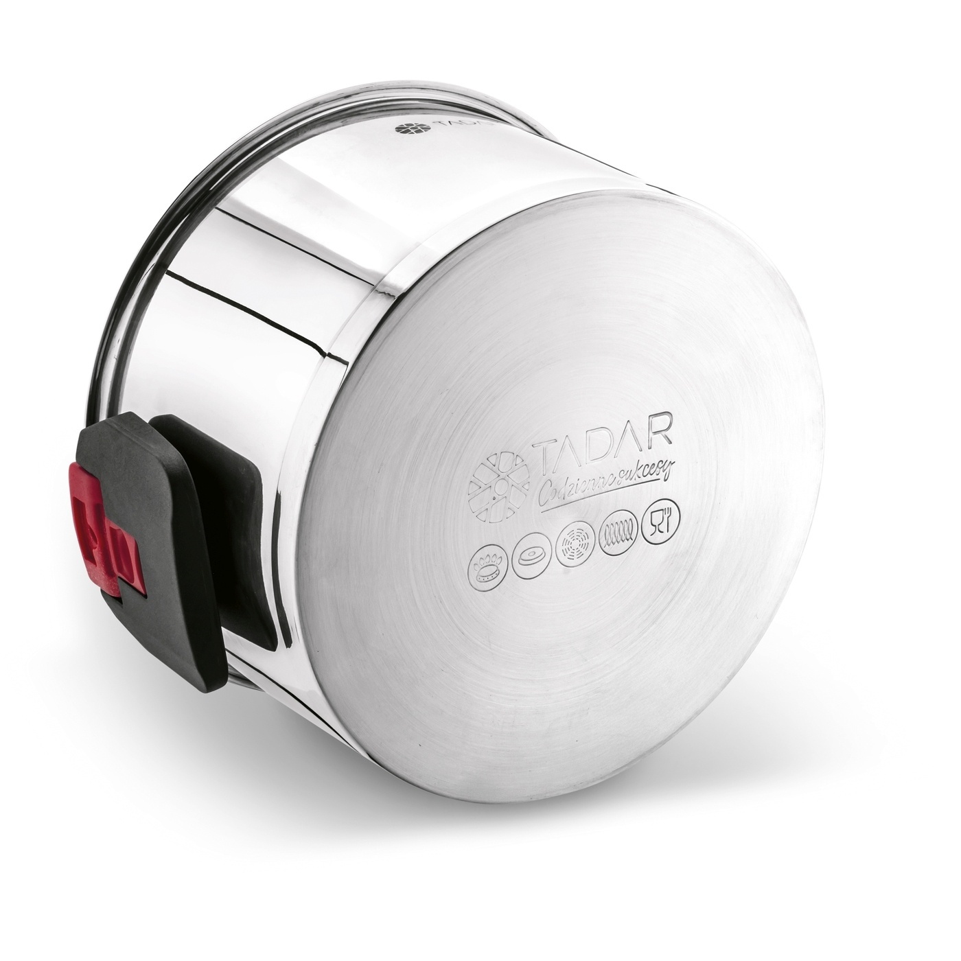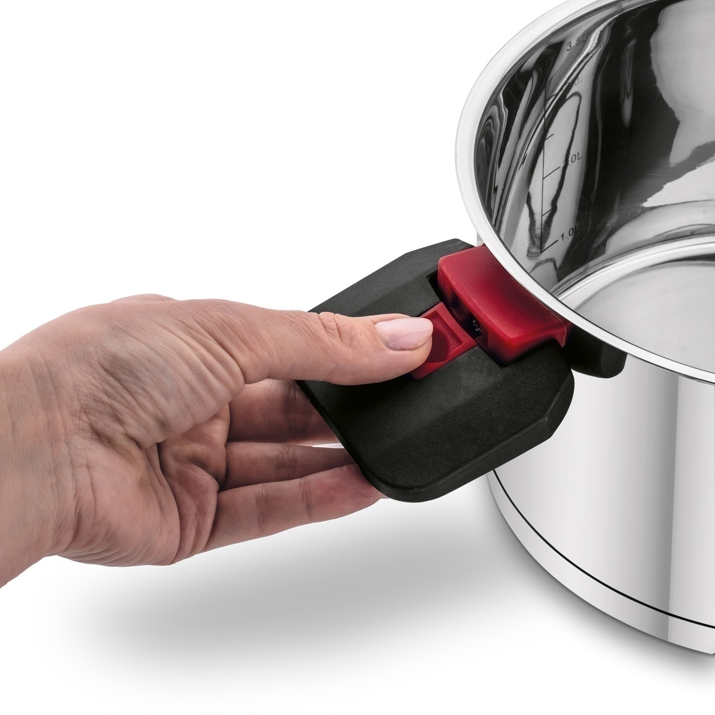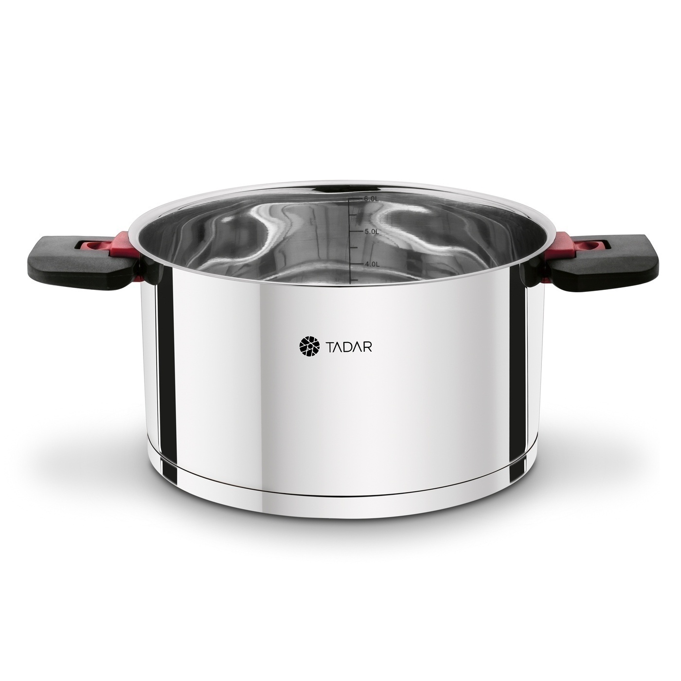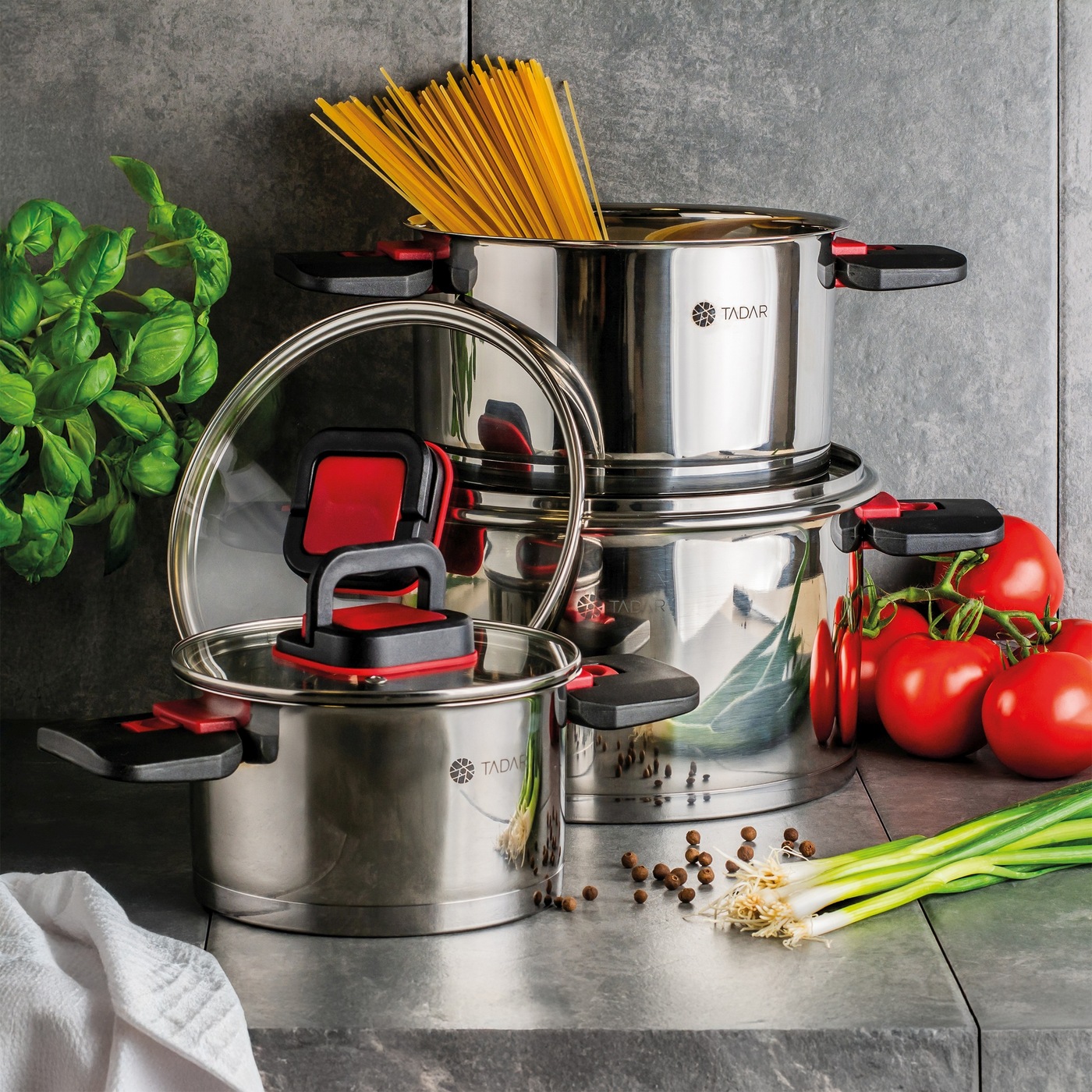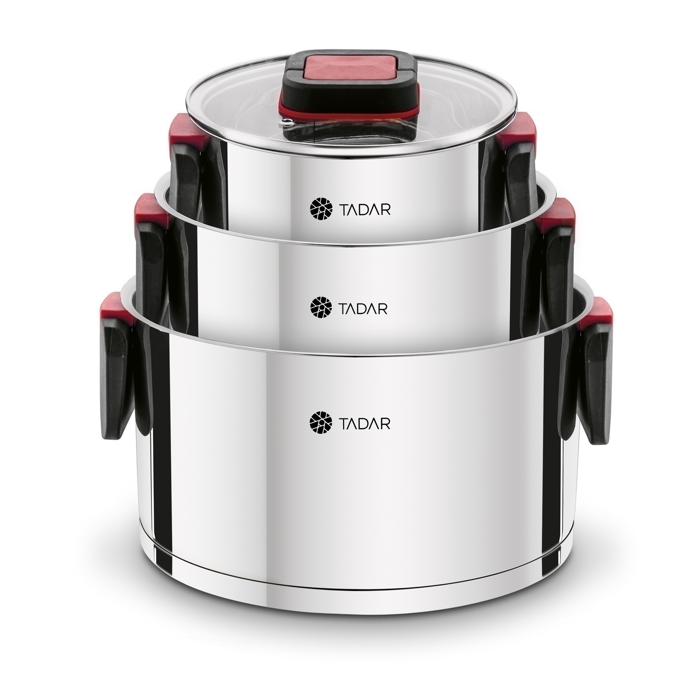 Natomiast rączki w zestawie garnków ze stali nierdzewnej Tadar Evocook 6 elementów i dołączonych pokrywek dedykowanych są składane oraz mają blokadę. Wyobraź sobie, jak bardzo ułatwia to codzienne przechowywanie zestawu w domowej kuchni. Na dodatek uchwyty te nie nagrzewają się. Wewnątrz korpusów znajdziesz skalę litrażu (1,5 / 3 / 6 litra!).