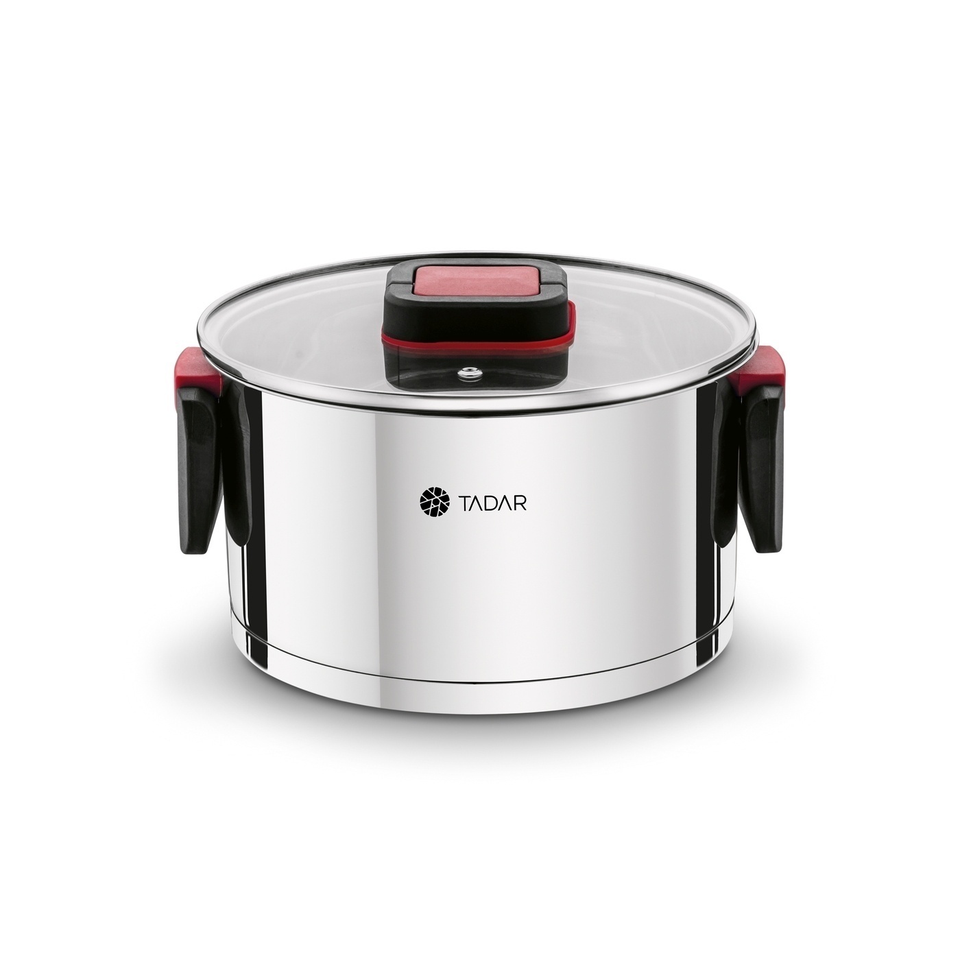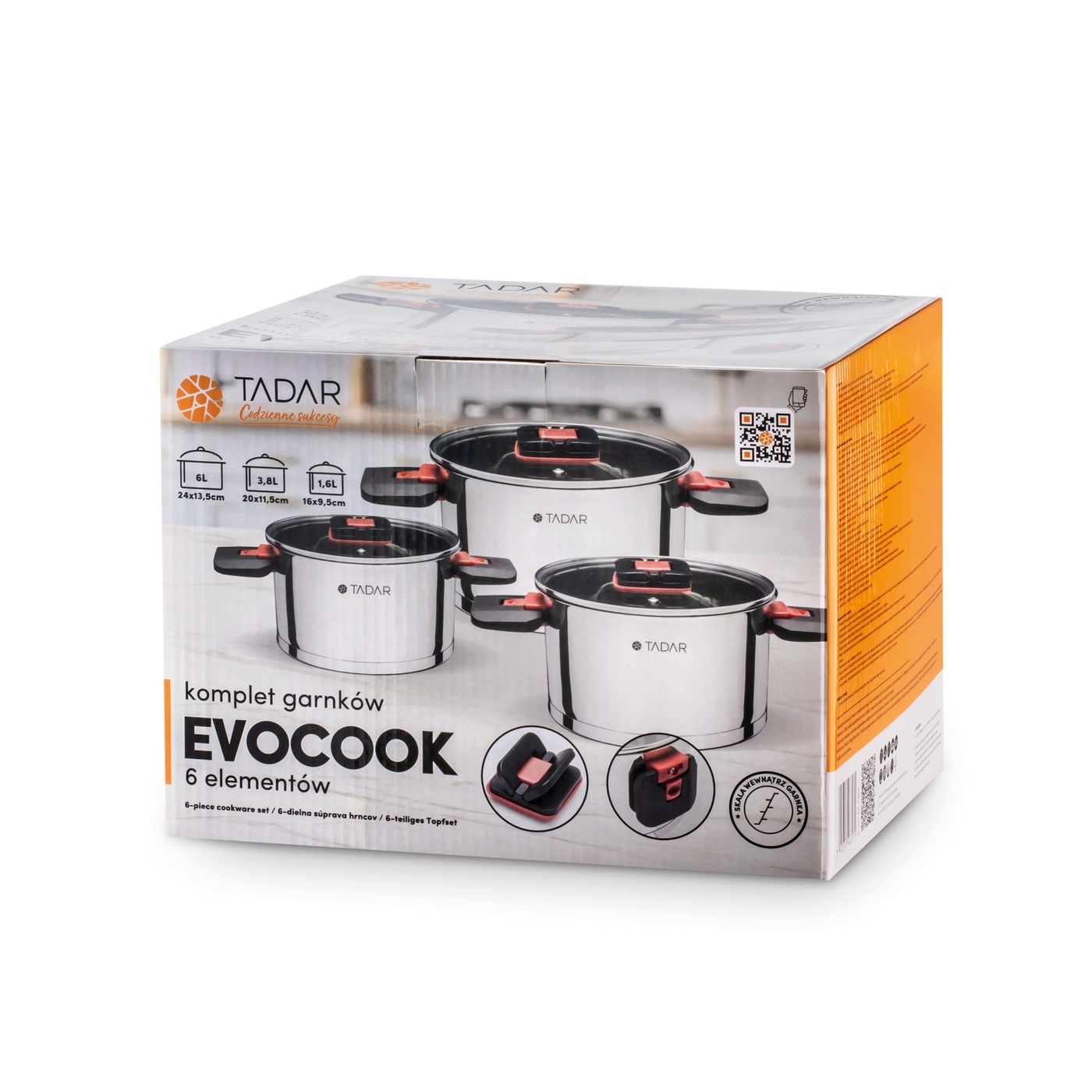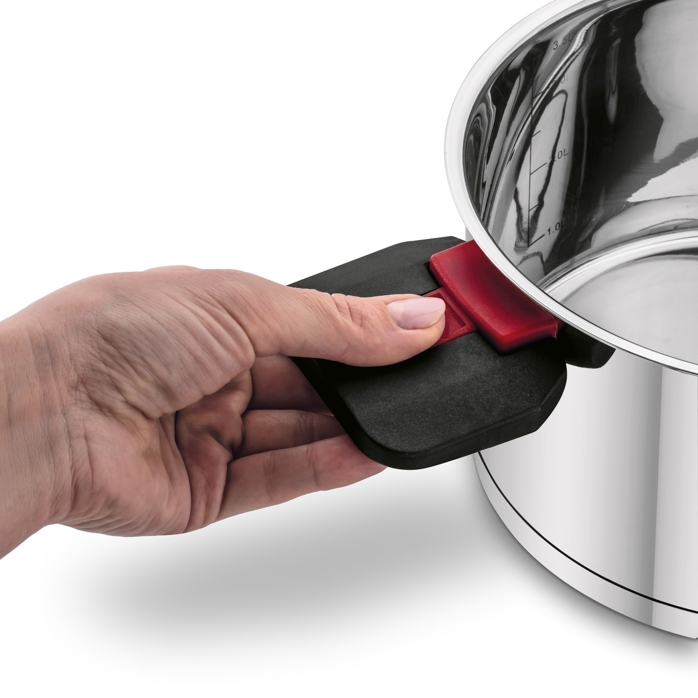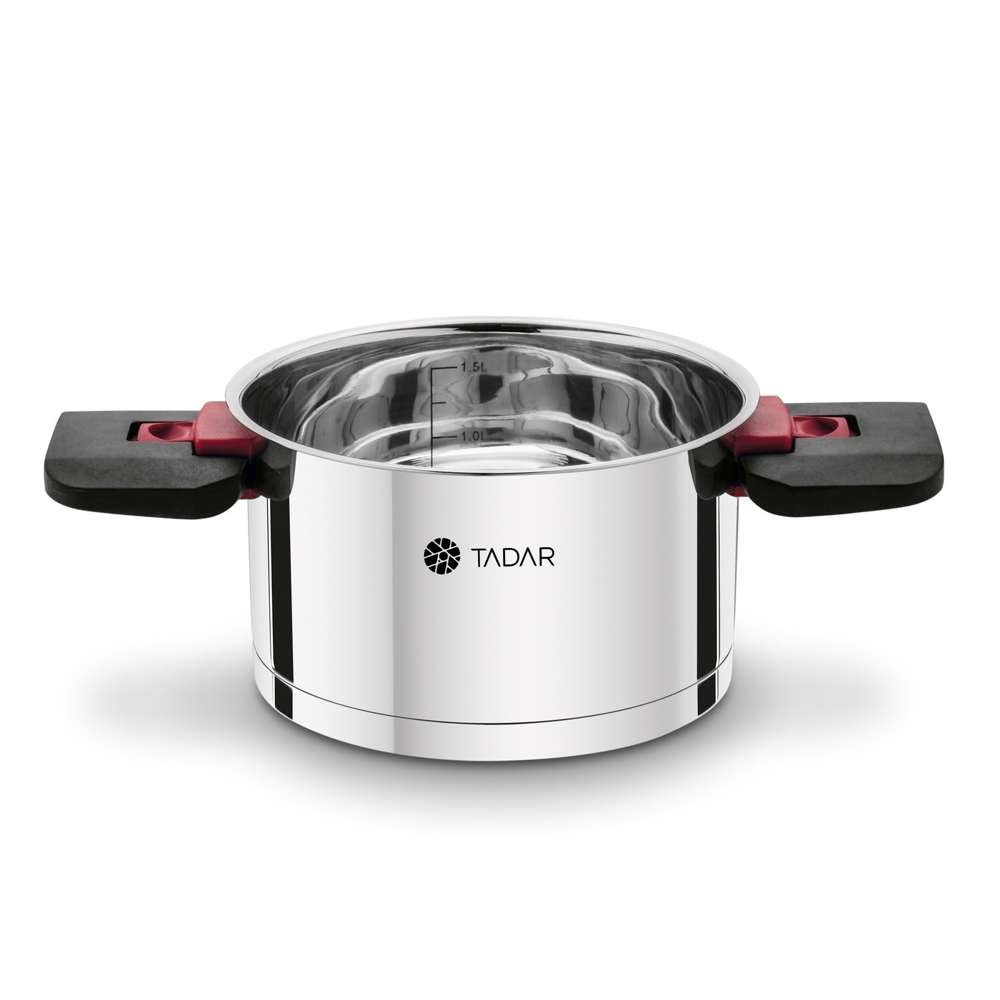 Natomiast rączki w zestawie garnków ze stali nierdzewnej Tadar Evocook 6 elementów i dołączonych pokrywek dedykowanych są składane oraz mają blokadę. Wyobraź sobie, jak bardzo ułatwia to codzienne przechowywanie zestawu w domowej kuchni. Na dodatek uchwyty te nie nagrzewają się. Wewnątrz korpusów znajdziesz skalę litrażu (1,5 / 3 / 6 litra!).