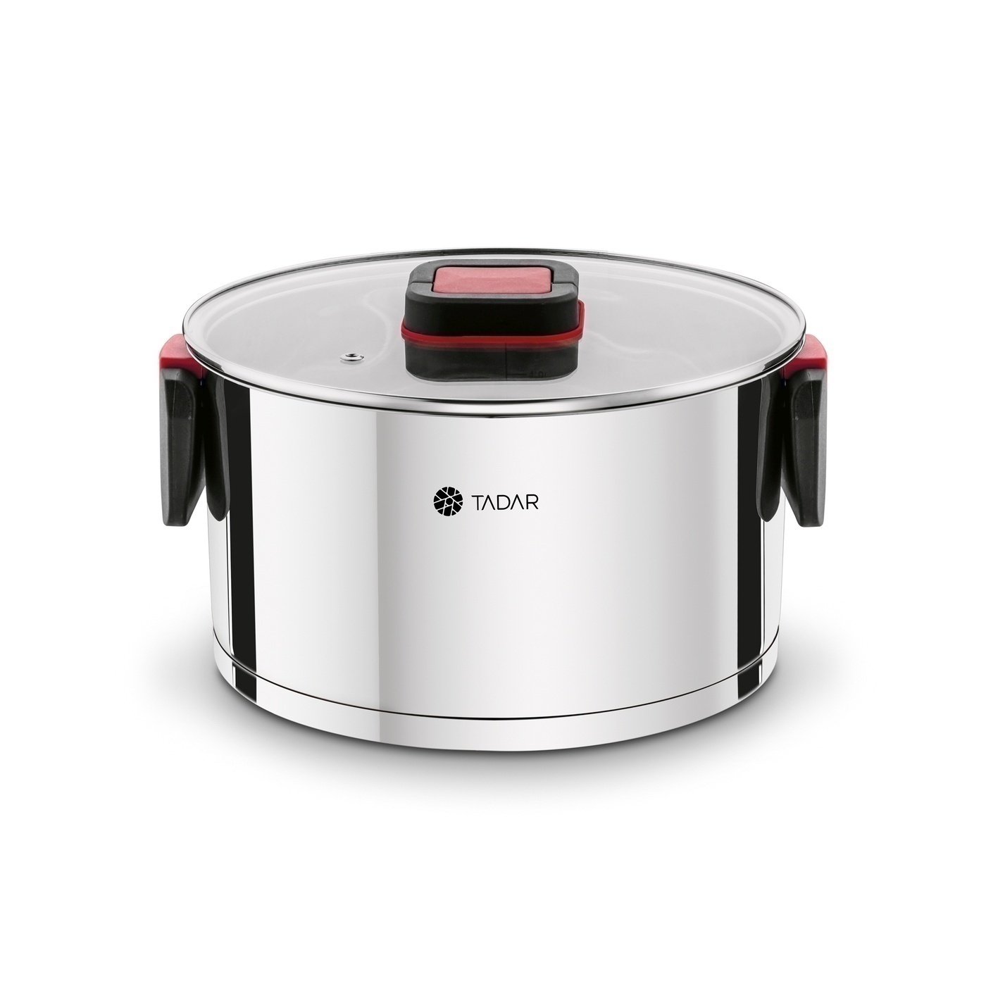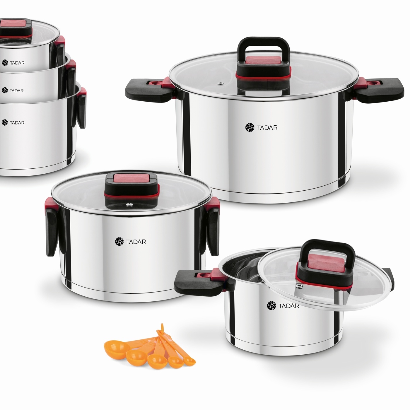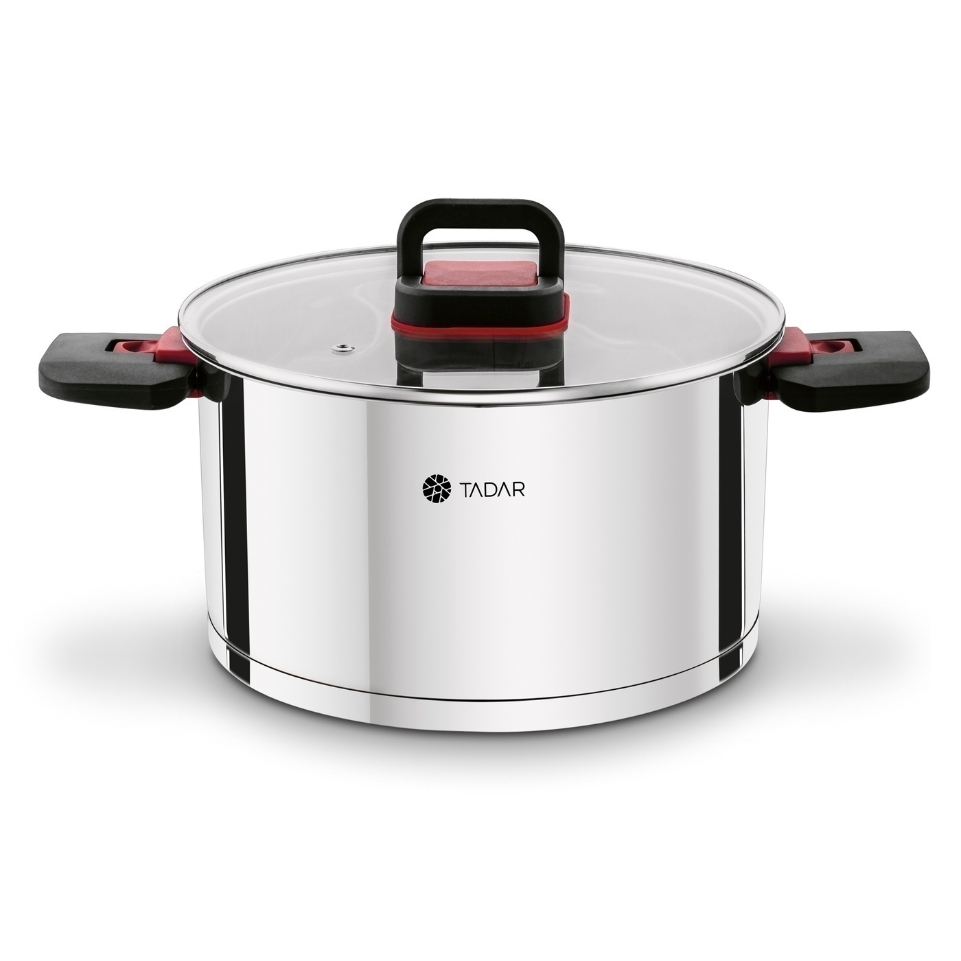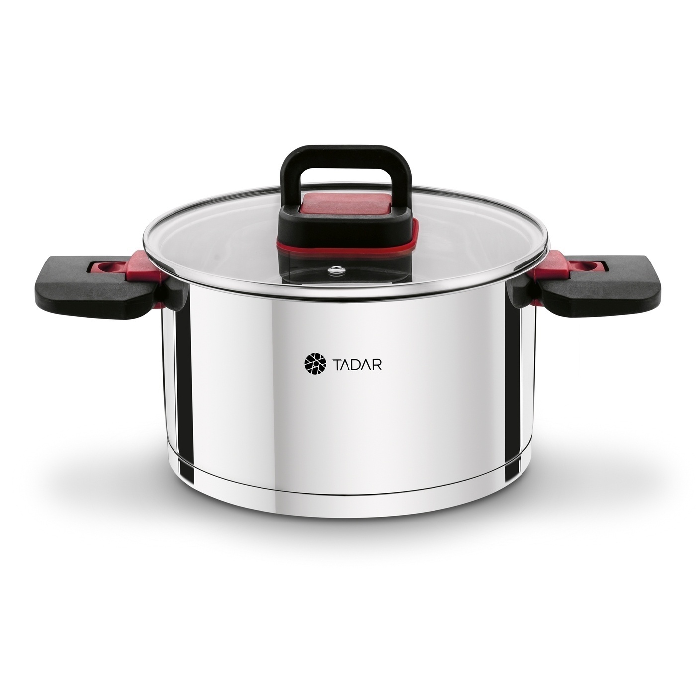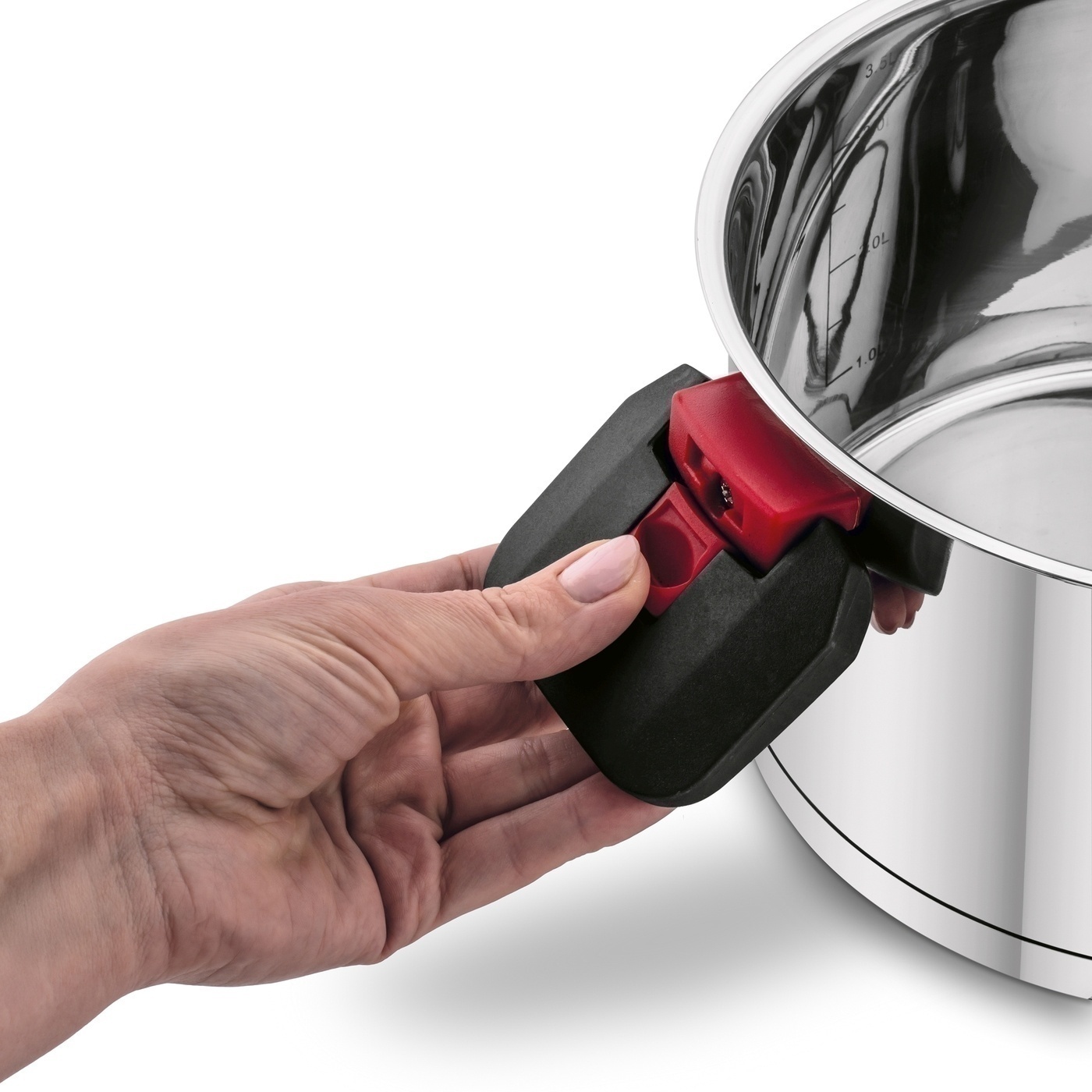Natomiast rączki w zestawie garnków ze stali nierdzewnej Tadar Evocook 6 elementów i dołączonych pokrywek dedykowanych są składane oraz mają blokadę. Wyobraź sobie, jak bardzo ułatwia to codzienne przechowywanie zestawu w domowej kuchni. Na dodatek uchwyty te nie nagrzewają się. Wewnątrz korpusów znajdziesz skalę litrażu (1,5 / 3 / 6 litra!).