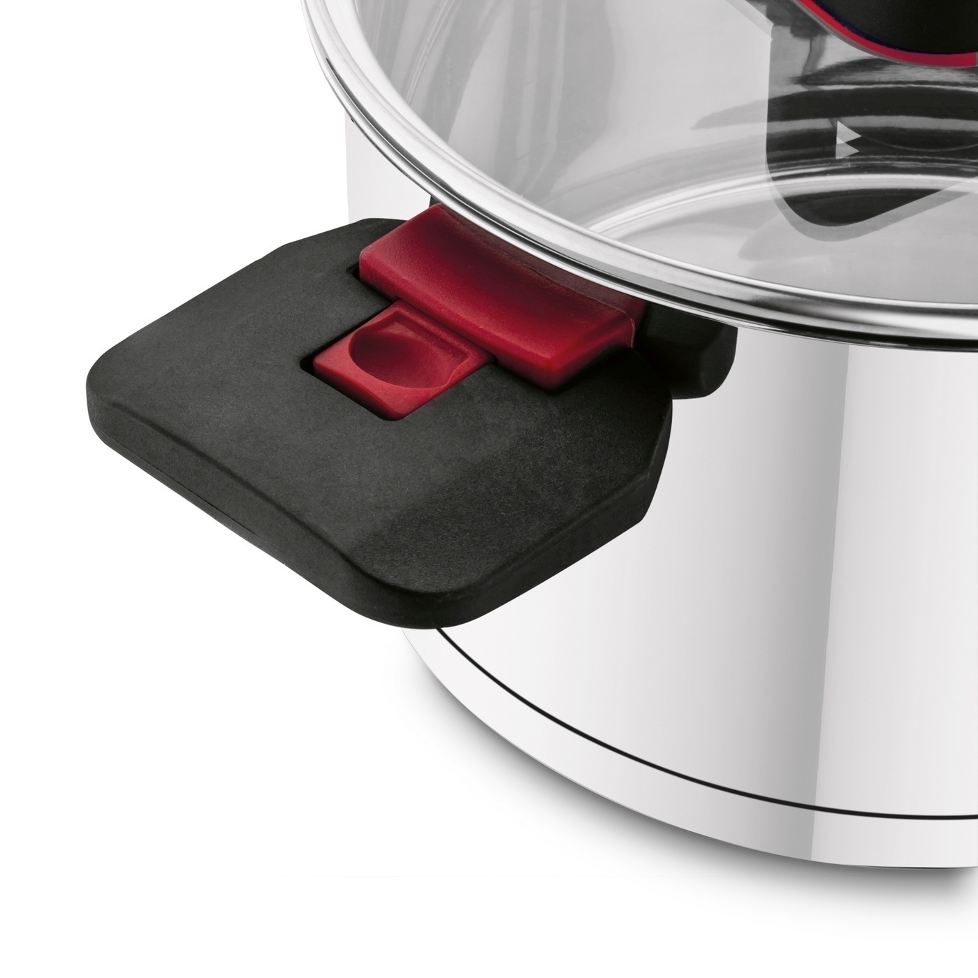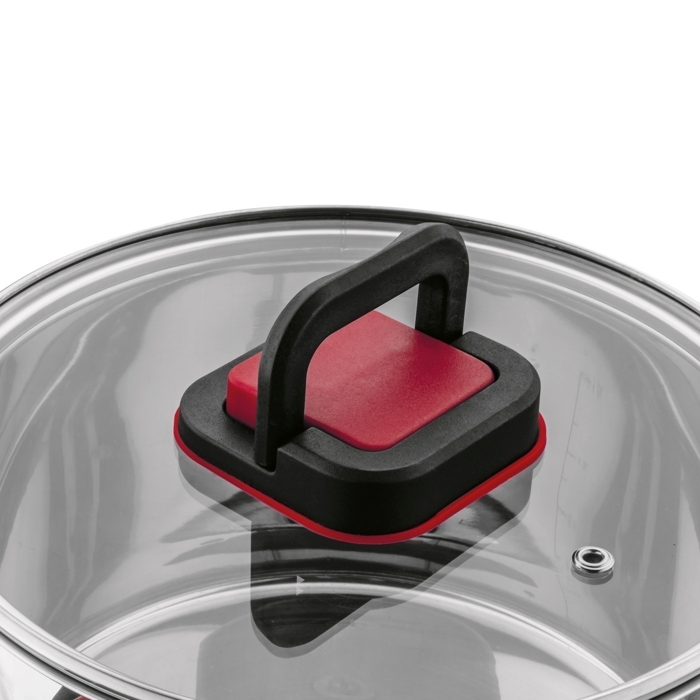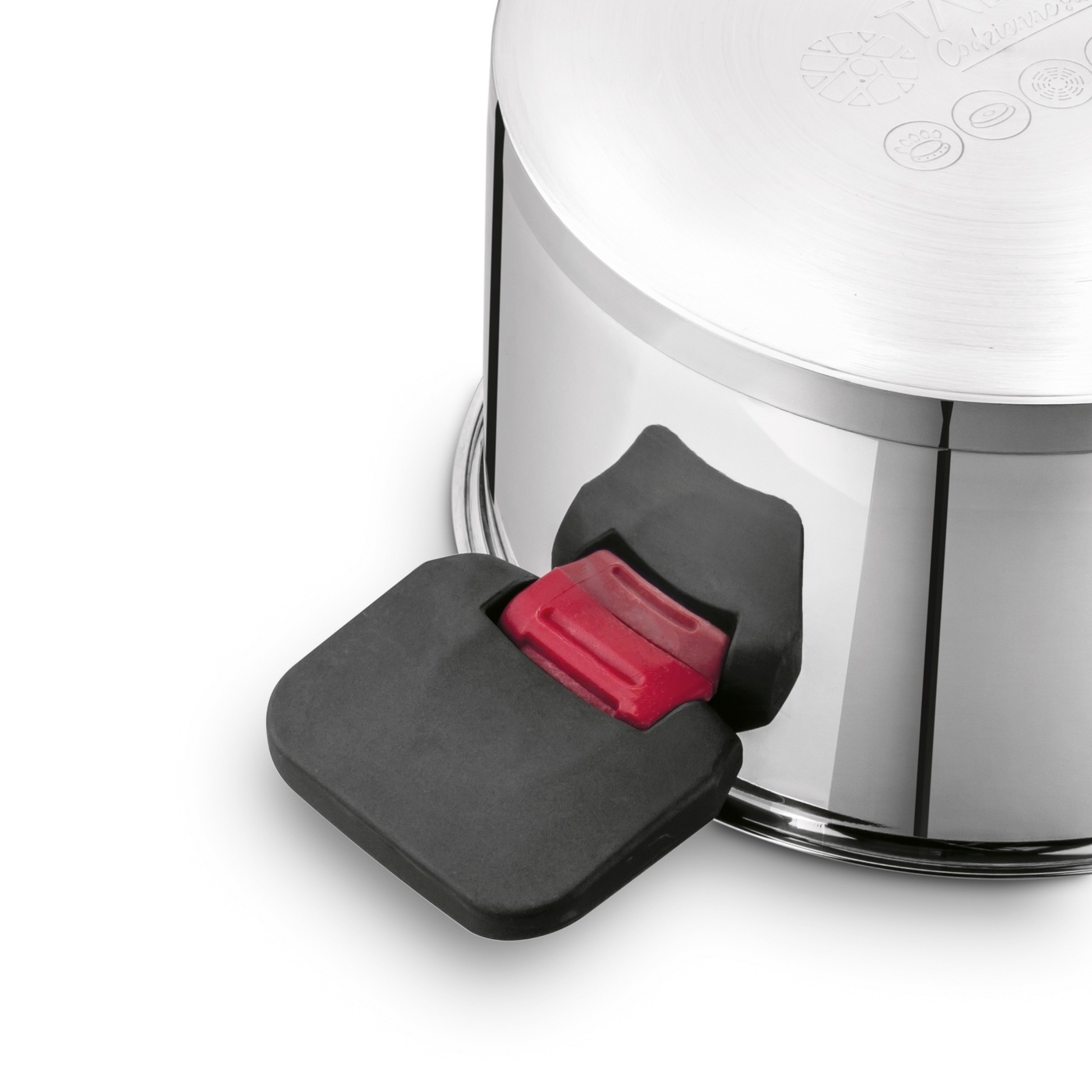 - garnki wykonane ze stali nierdzewnej - pokrywy szklane ze stalowym rantem i odpowietrznikiem - uchwyty składane z tworzywa sztucznego, przykręcane - skala litrażu - miarki wykonane z tworzywa sztucznego |
