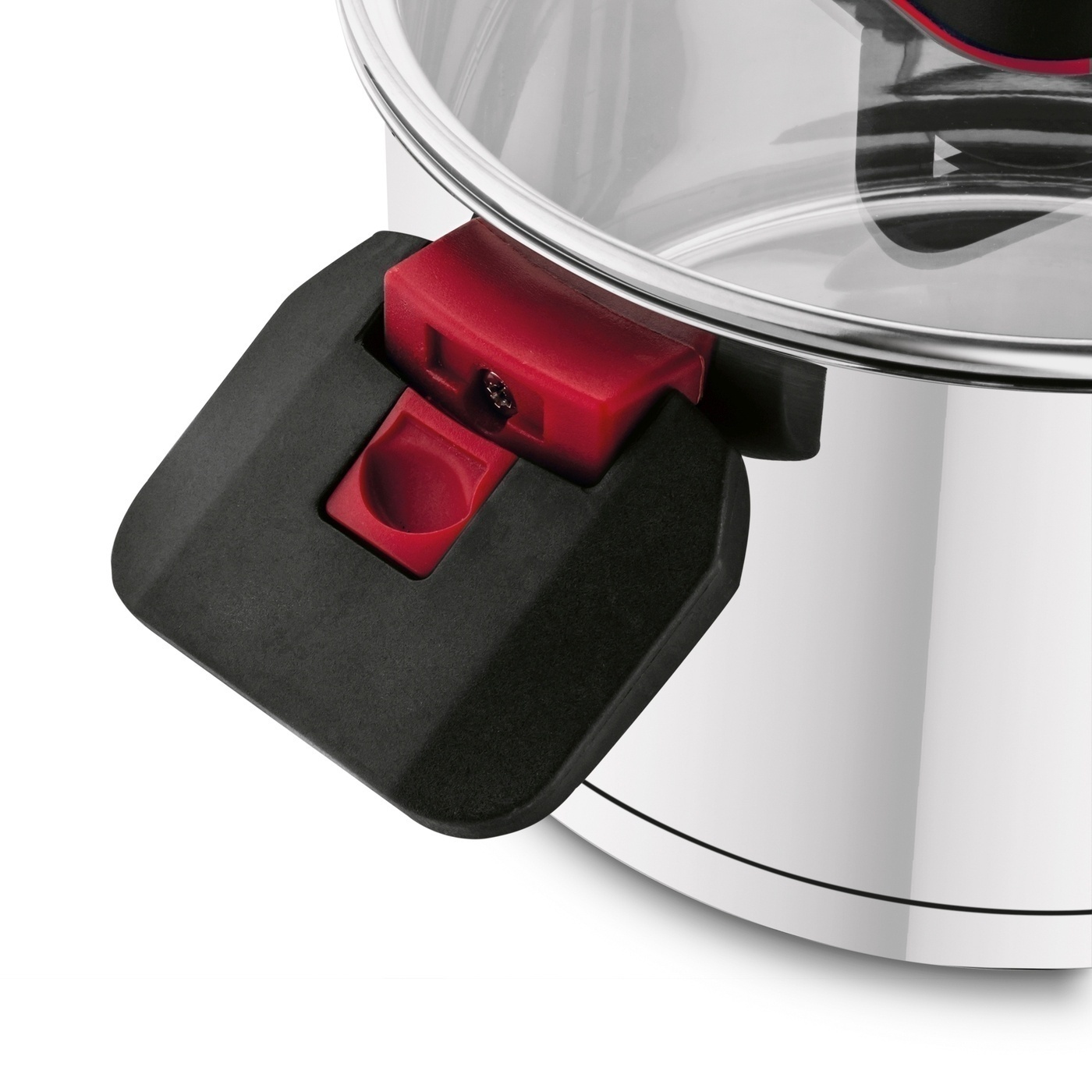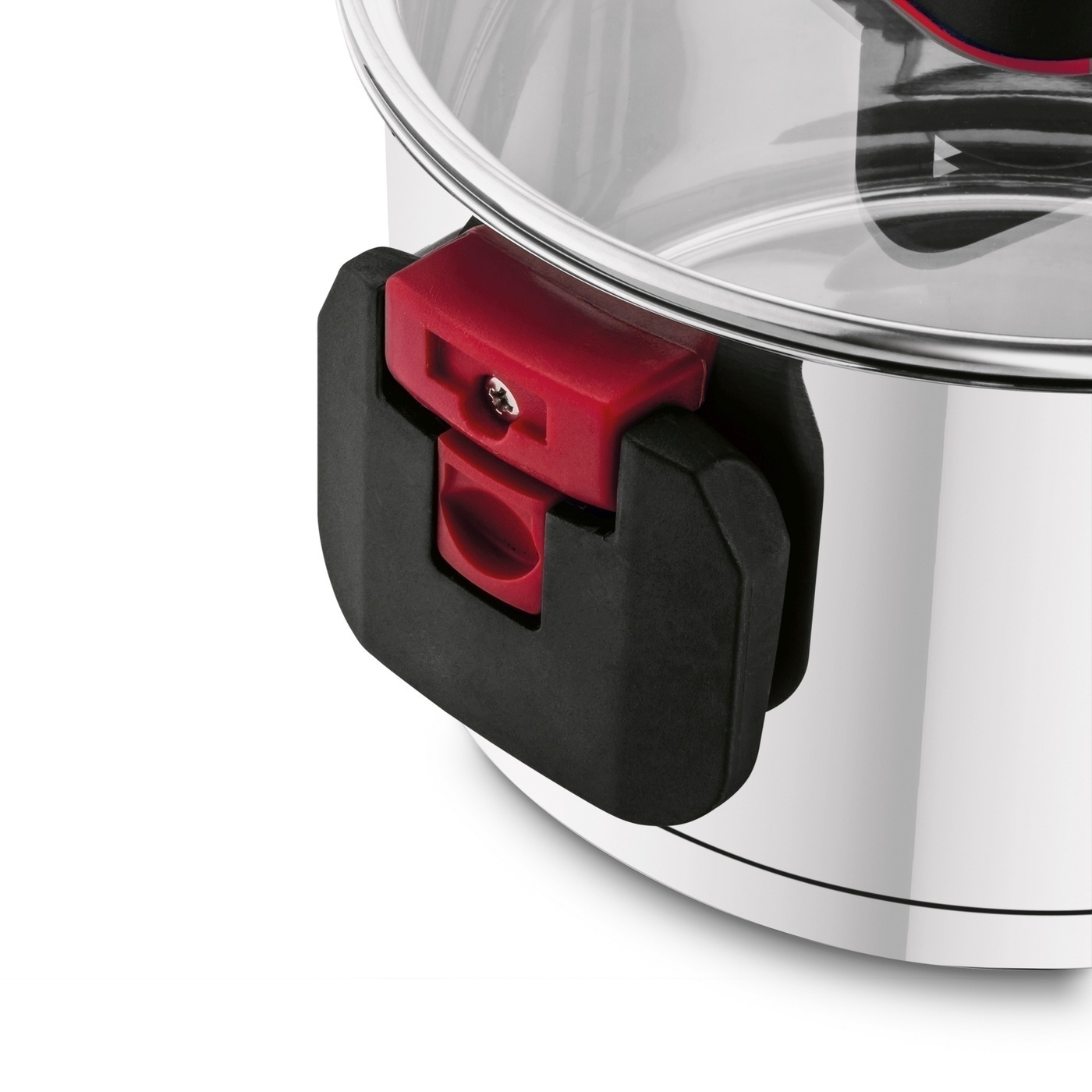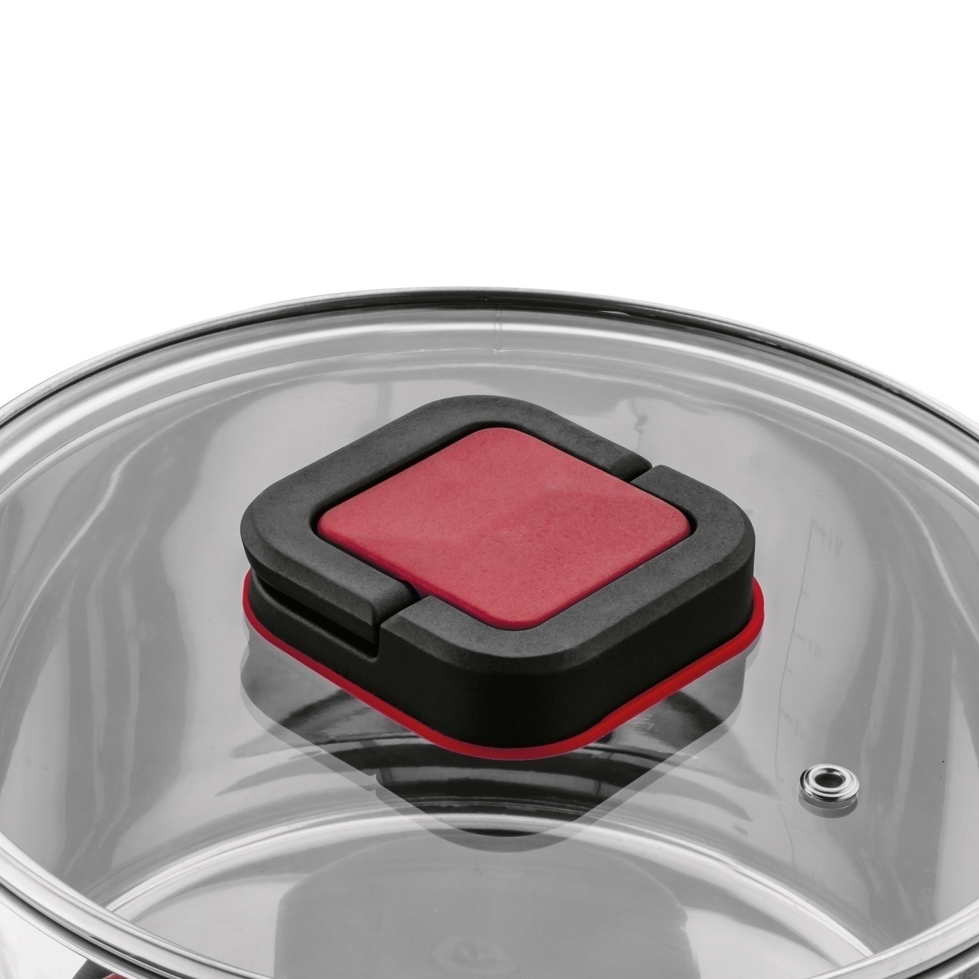 - garnki wykonane ze stali nierdzewnej - pokrywy szklane ze stalowym rantem i odpowietrznikiem - uchwyty składane z tworzywa sztucznego, przykręcane - skala litrażu - miarki wykonane z tworzywa sztucznego |