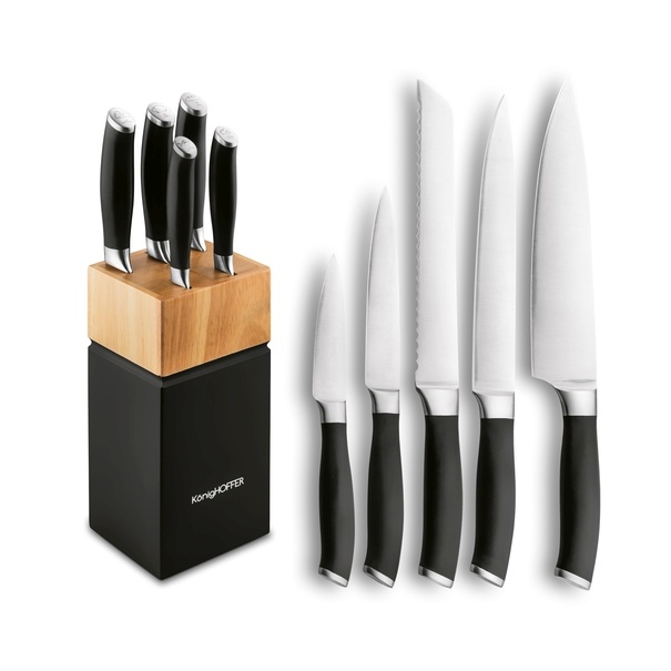 - stojak wykonany z drewna kauczukowego - noże wykonane ze stali nierdzewnej - rękojeść pokryta tworzywem sztucznym w kolorze czarnym |