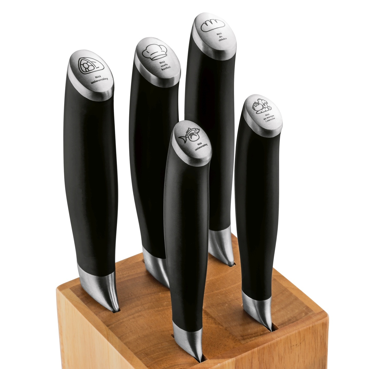 - stojak - nóż szefa kuchni - nóż do chleba - nóż uniwersalny 20 cm - nóż uniwersalny 12,5 cm - nóż do warzyw i owoców |