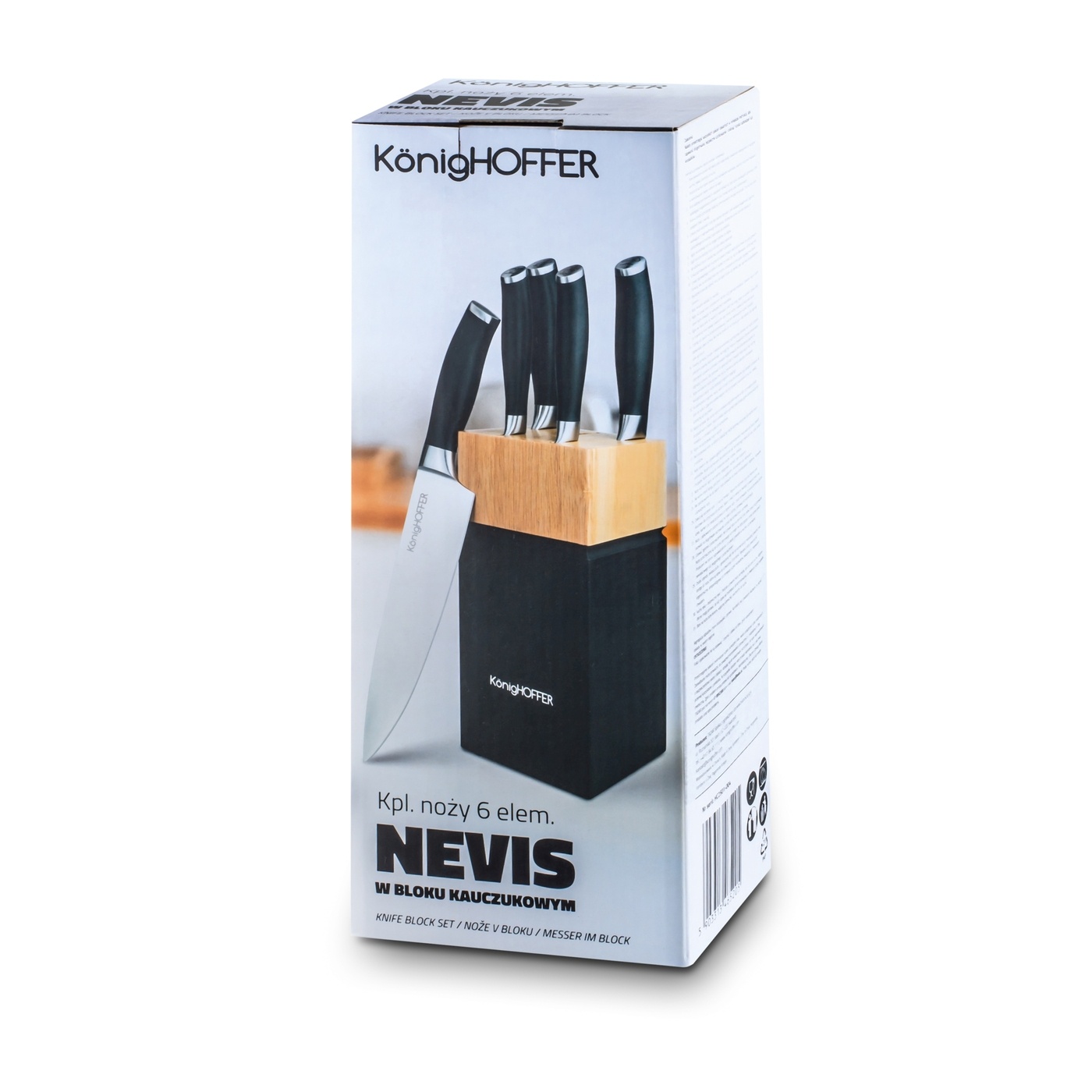 Zestaw noży kuchennych Könighoffer Nevis to komplet zaprojektowany z myślą o codziennych pracach kuchennych. W skład zestawu wchodzi pięć noży o różnym przeznaczeniu oraz stabilny blok wykonany z drewna kauczukowego.