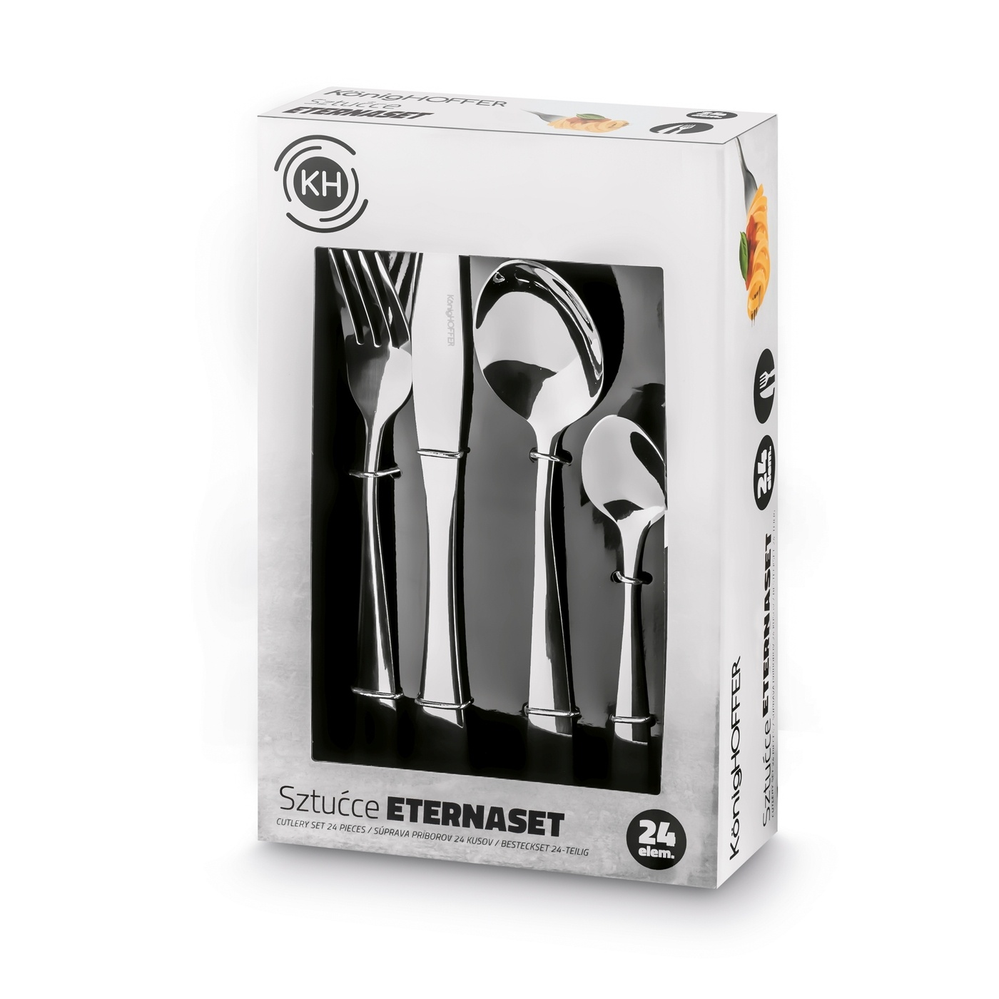 Komplet zapakowany jest w kolorowe pudełko typu window box, które zabezpiecza zawartość i ułatwia przechowywanie. Zestaw Konighoffer Eternaset sprawdzi się także jako praktyczny prezent do nowego domu lub na inne okazje.